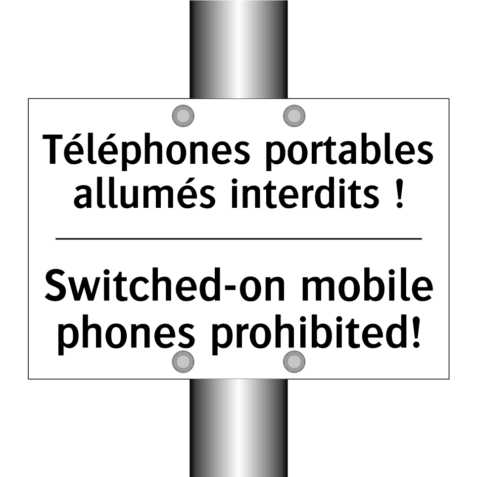 Panneau d'interdiction bilingue avec texte en français : "Téléphones portables allumés interdits !", et en anglais : "Switched-on mobile phones prohibited!"