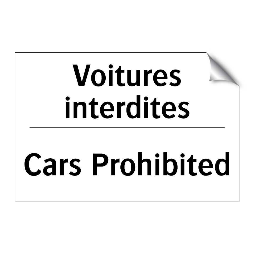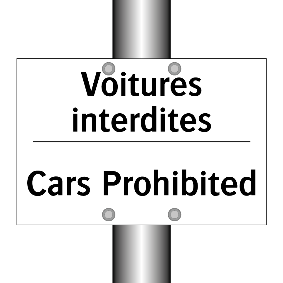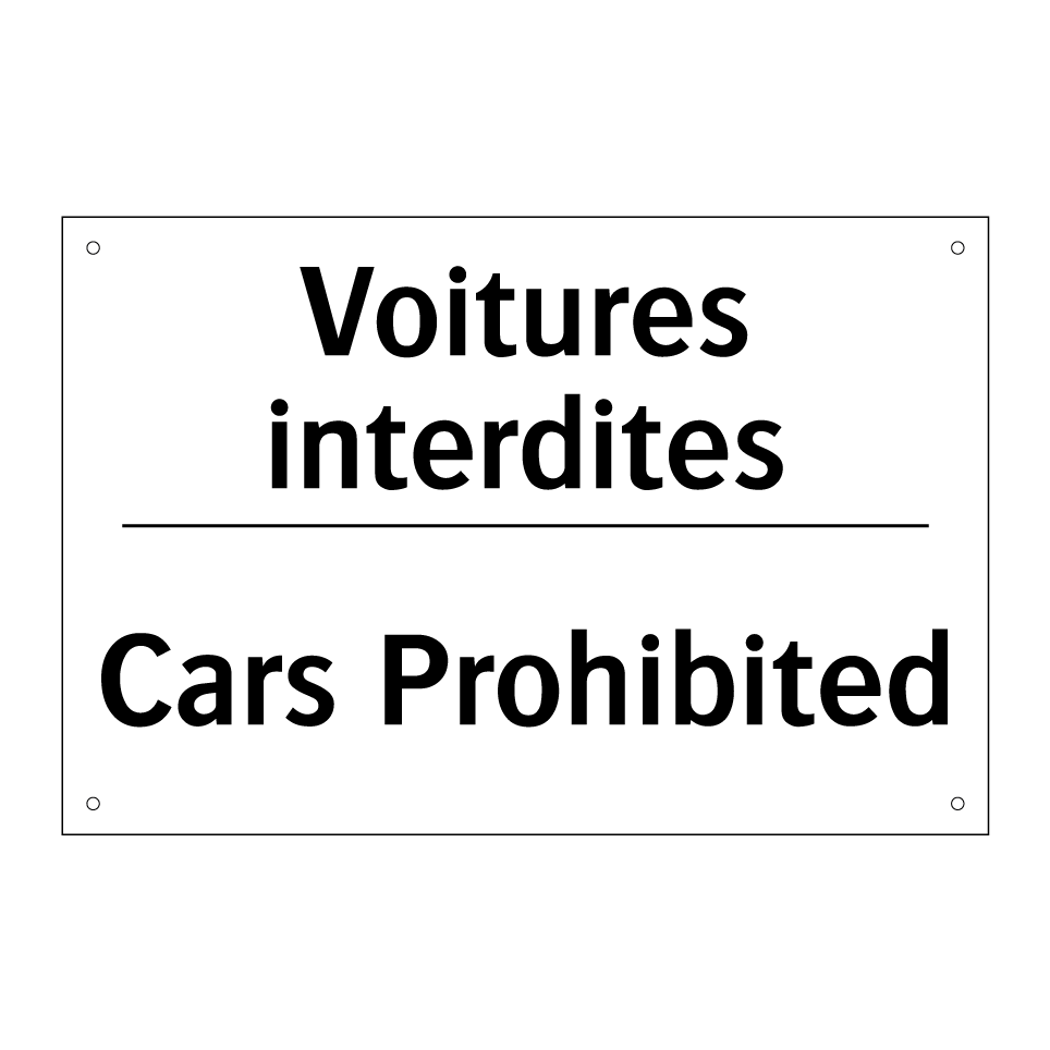 Panneau d'interdiction bilingue avec texte en français : "Voitures interdites", et en anglais : "Cars Prohibited"