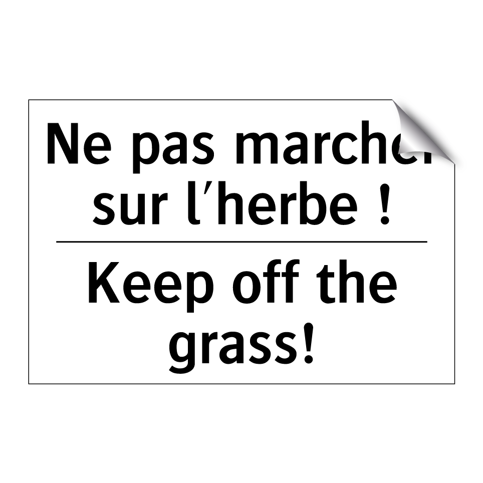 Panneau d'interdiction bilingue avec texte en français : "Ne pas marcher sur l'herbe !", et en anglais : "Keep off the grass!"