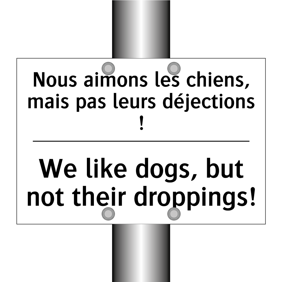 Panneau d'interdiction bilingue avec texte en français : "Nous aimons les chiens, mais pas leurs déjections !", et en anglais : "We like dogs, but not their droppings!"