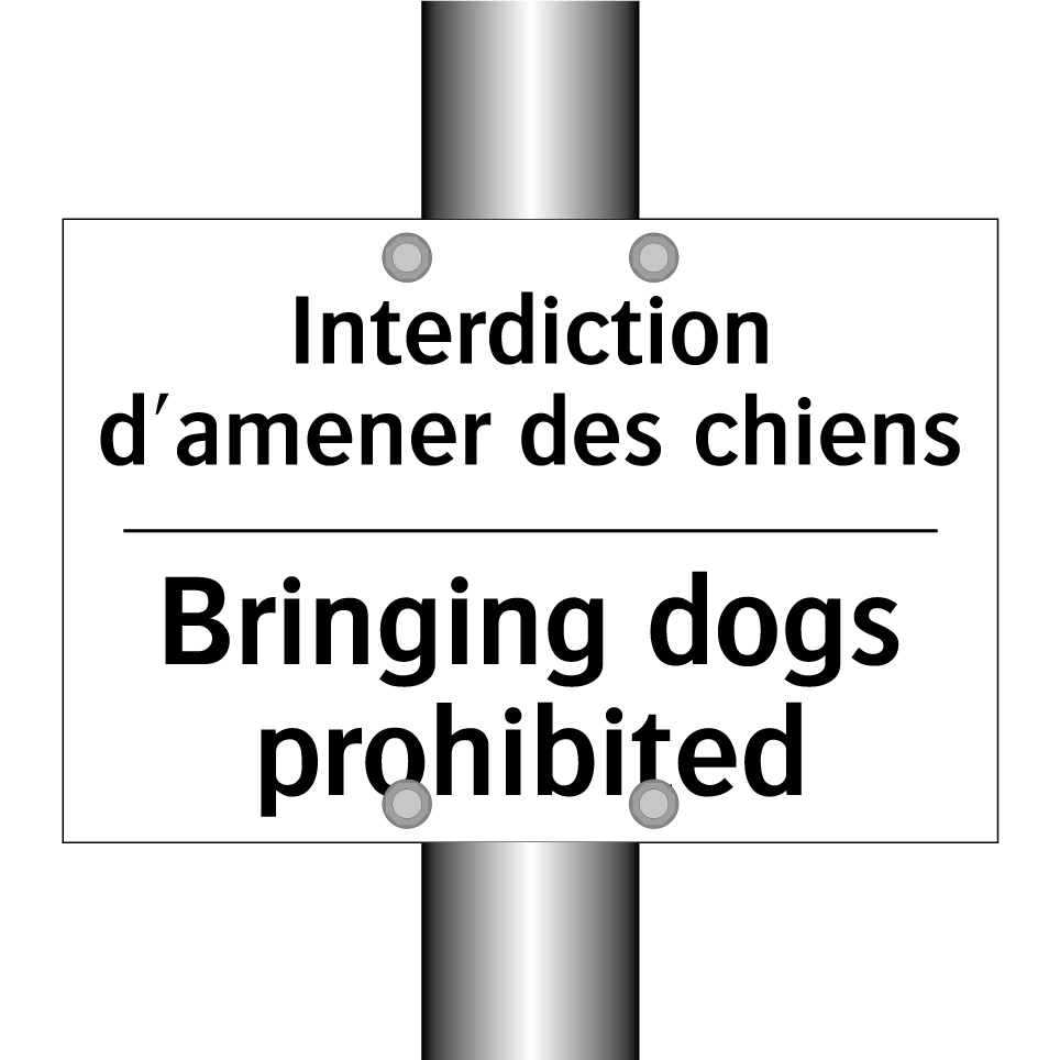 Panneau d'interdiction bilingue avec texte en français : "Interdiction d'amener des chiens", et en anglais : "Bringing dogs prohibited"