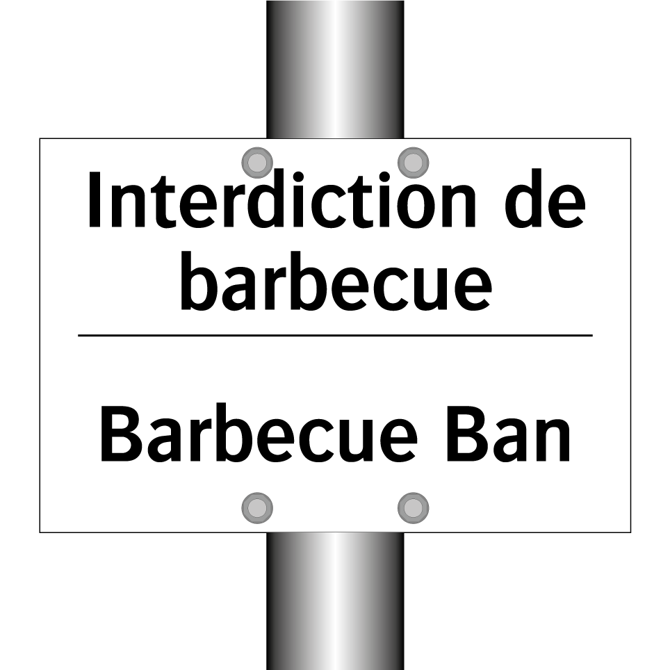 Panneau d'interdiction bilingue avec texte en français : "Interdiction de barbecue", et en anglais : "Barbecue Ban"
