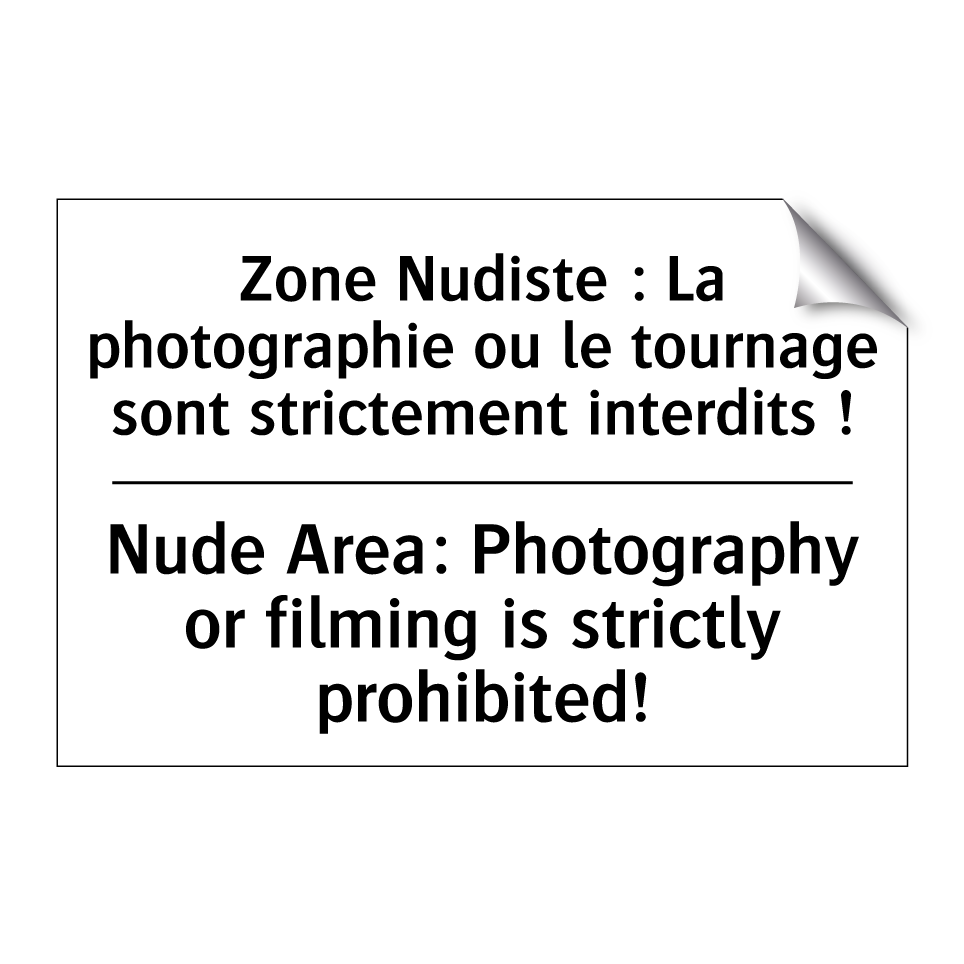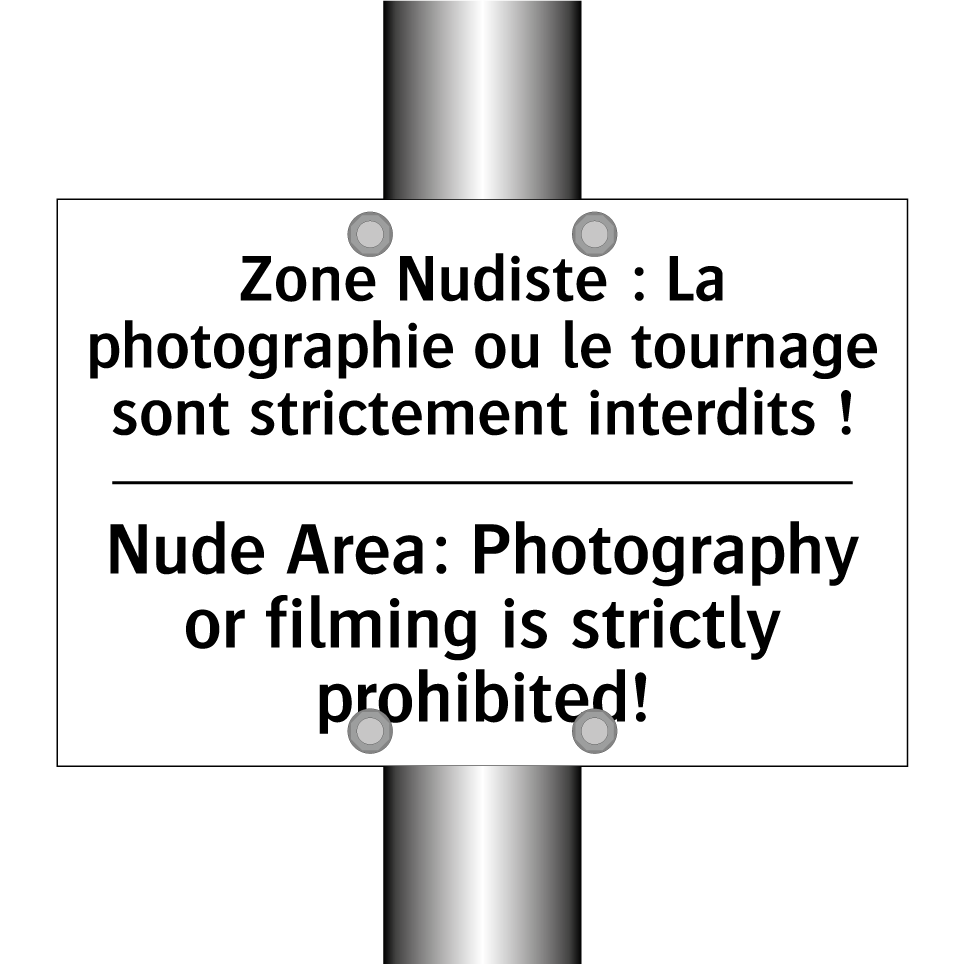 Panneau d'interdiction bilingue avec texte en français : "Zone Nudiste : La photographie ou le tournage sont strictement interdits !", et en anglais : "Nude Area: Photography or filming is strictly prohibited!"
