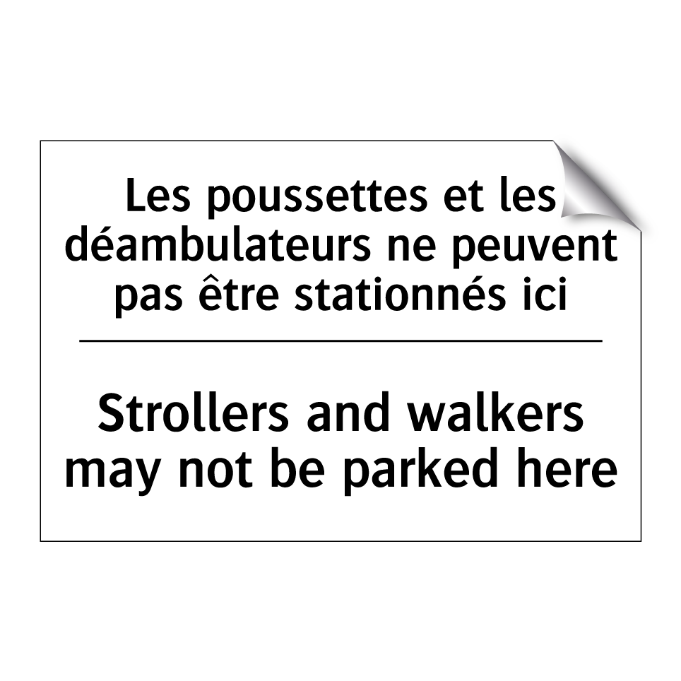 Panneau d'interdiction bilingue avec texte en français : "Les poussettes et les déambulateurs ne peuvent pas être stationnés ici", et en anglais : "Strollers and walkers may not be parked here"