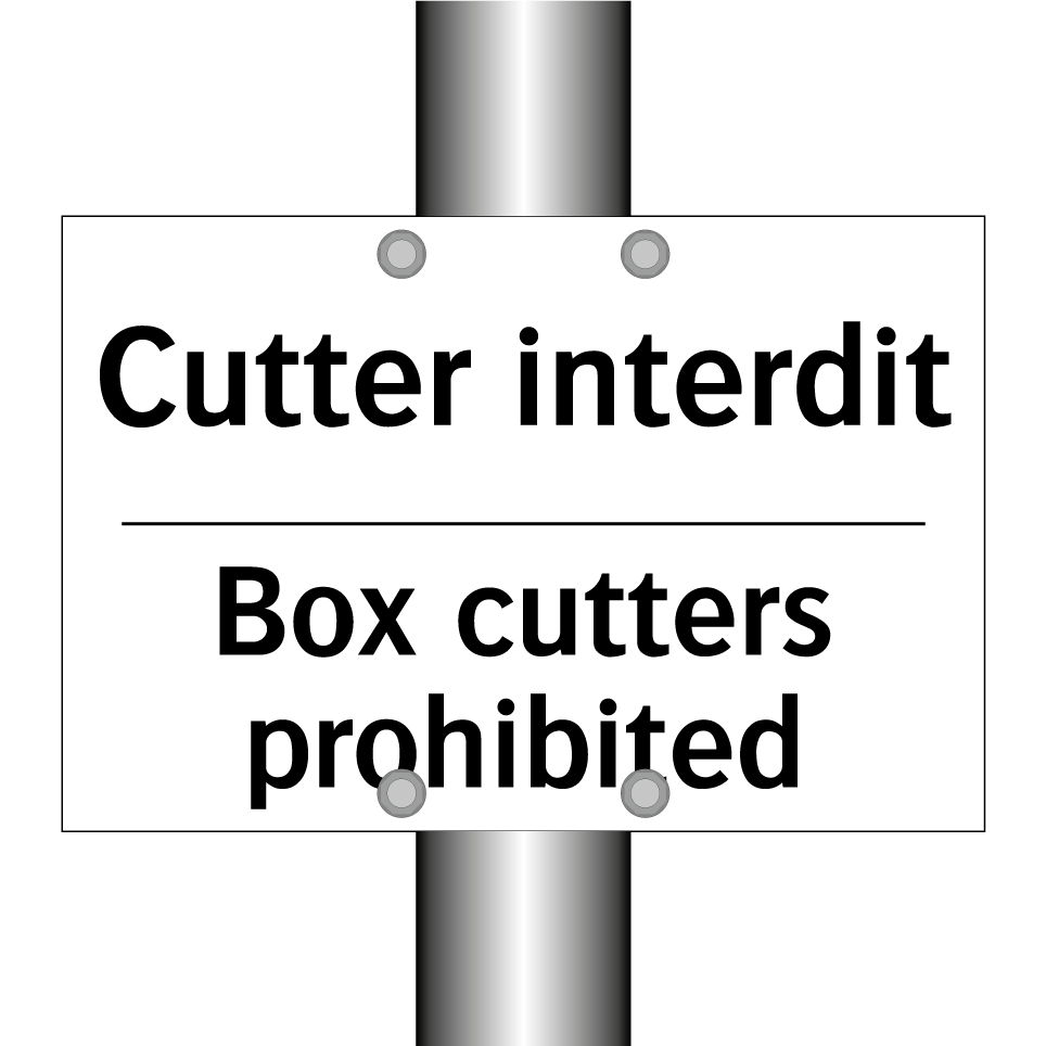 Panneau d'interdiction bilingue avec texte en français : "Cutter interdit", et en anglais : "Box cutters prohibited"
