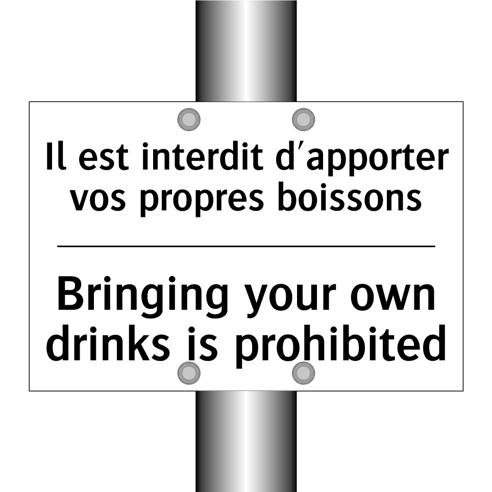 Panneau d'interdiction bilingue avec texte en français : "Il est interdit d'apporter vos propres boissons", et en anglais : "Bringing your own drinks is prohibited"