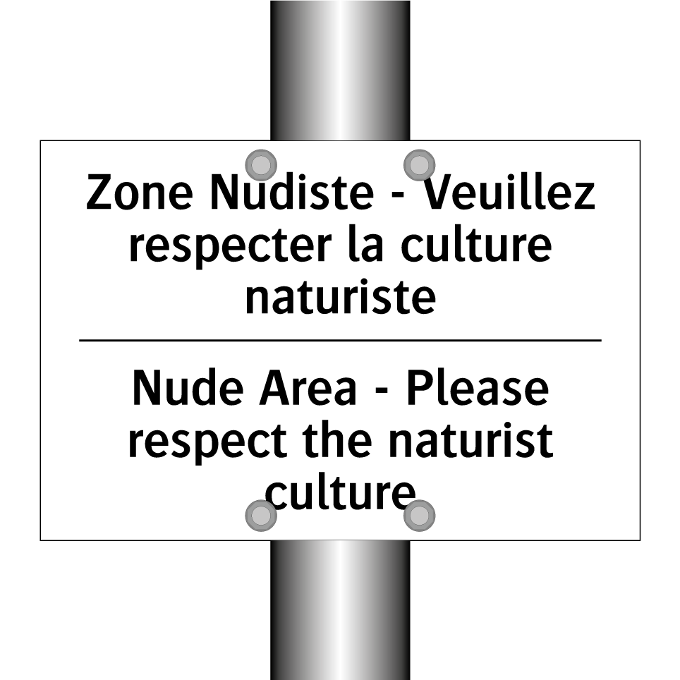 Panneau d'interdiction bilingue avec texte en français : "Zone Nudiste - Veuillez respecter la culture naturiste", et en anglais : "Nude Area - Please respect the naturist culture"