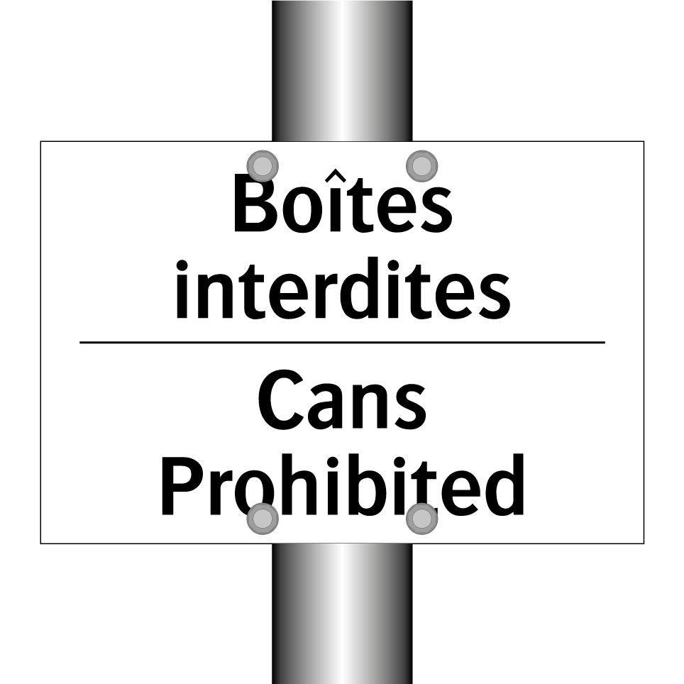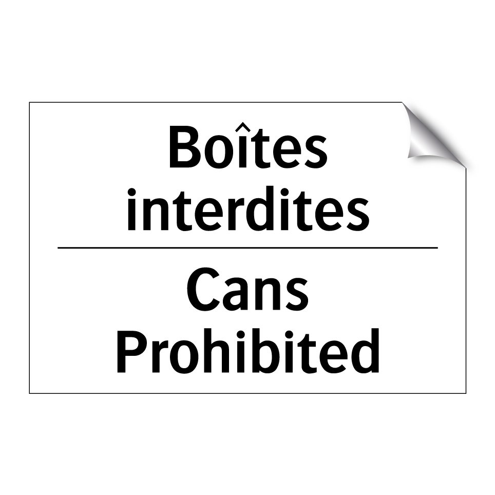 Panneau d'interdiction bilingue avec texte en français : "Boîtes interdites", et en anglais : "Cans Prohibited"