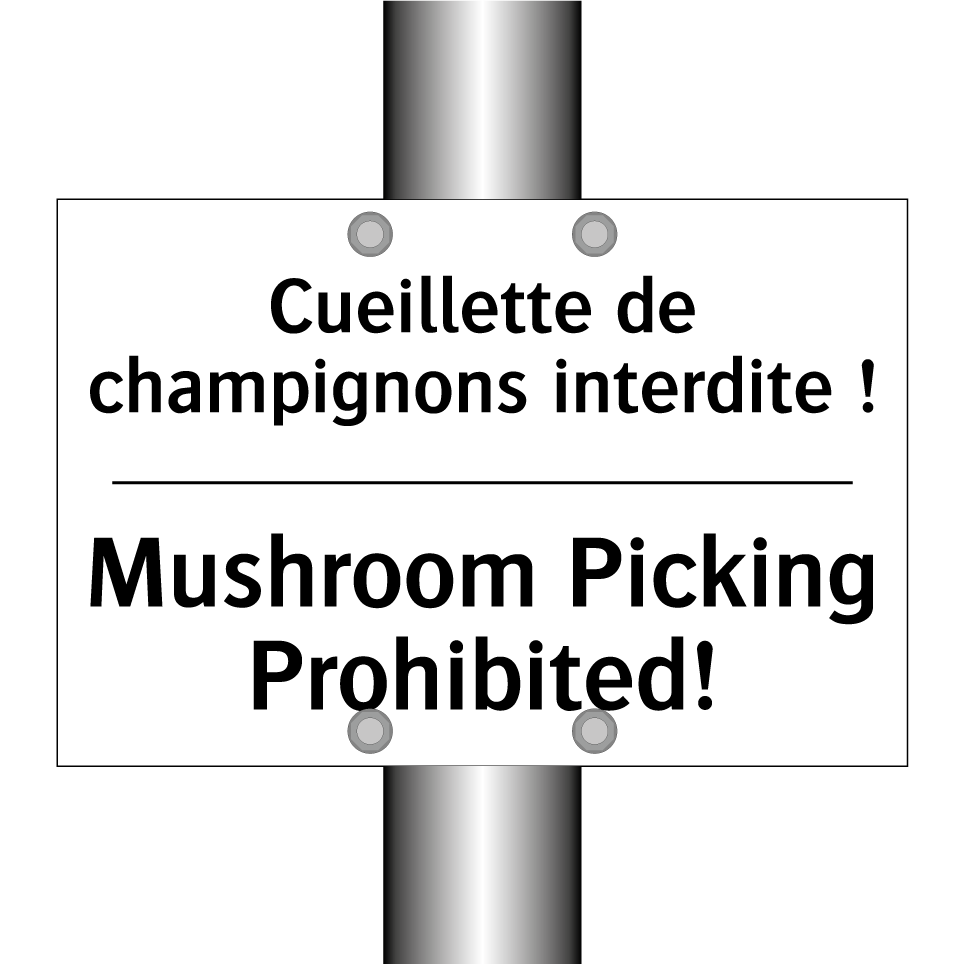 Panneau d'interdiction bilingue avec texte en français : "Cueillette de champignons interdite !", et en anglais : "Mushroom Picking Prohibited!"