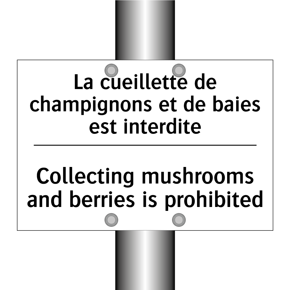 Panneau d'interdiction bilingue avec texte en français : "La cueillette de champignons et de baies est interdite", et en anglais : "Collecting mushrooms and berries is prohibited"