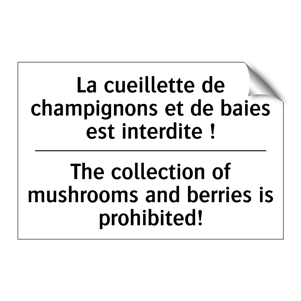 Panneau d'interdiction bilingue avec texte en français : "La cueillette de champignons et de baies est interdite !", et en anglais : "The collection of mushrooms and berries is prohibited!"