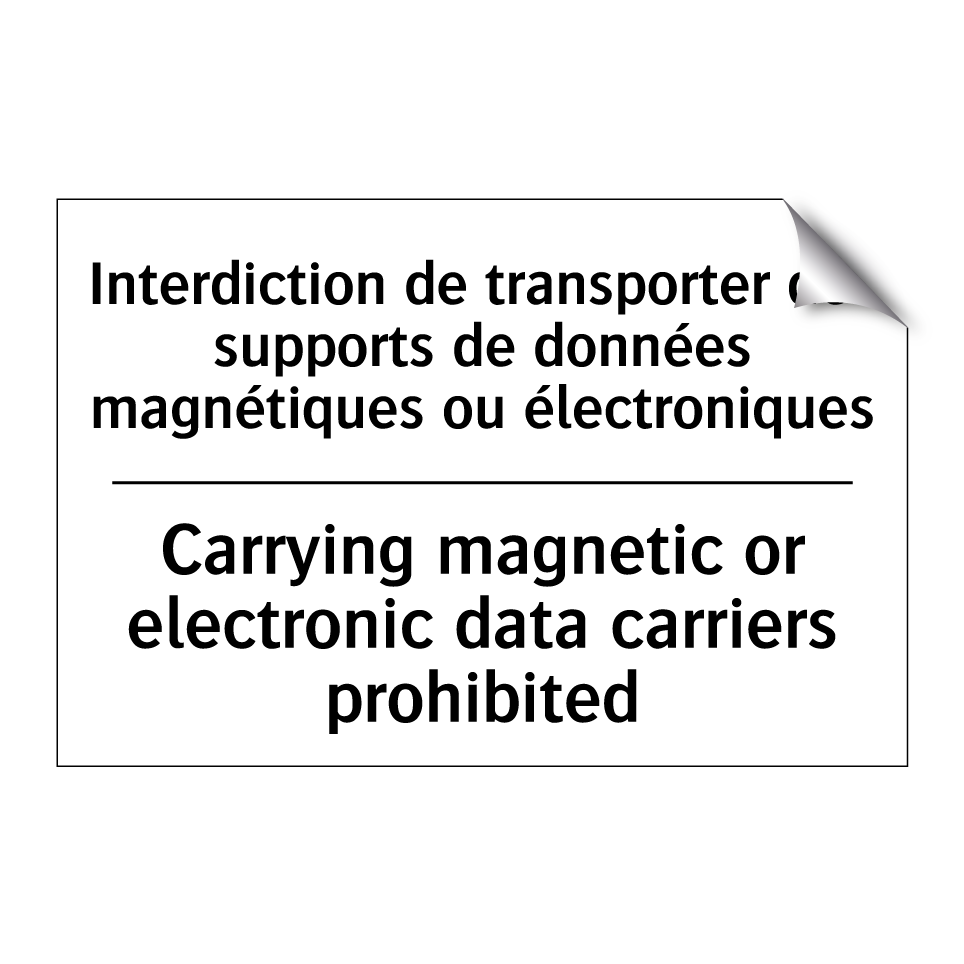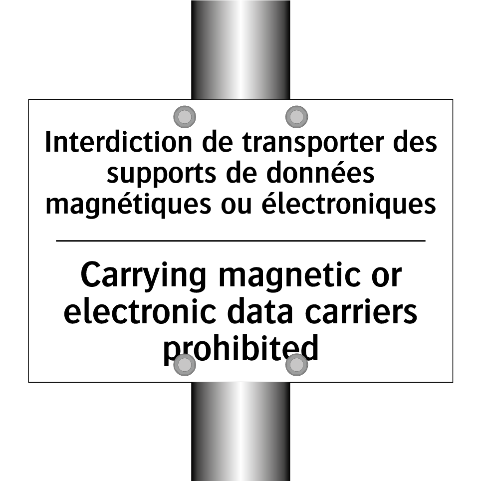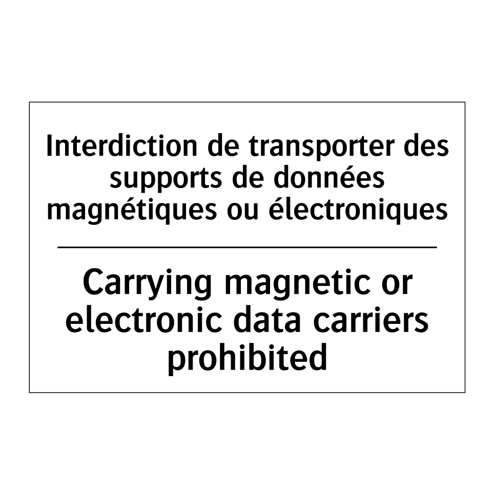 Panneau d'interdiction bilingue avec texte en français : "Interdiction de transporter des supports de données magnétiques ou électroniques", et en anglais : "Carrying magnetic or electronic data carriers prohibited"