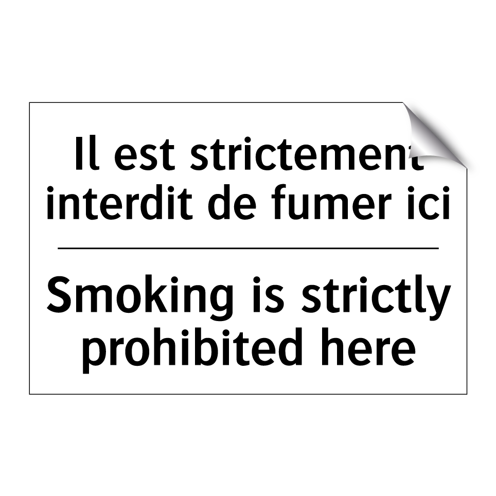 Panneau d'interdiction bilingue avec texte en français : "Il est strictement interdit de fumer ici", et en anglais : "Smoking is strictly prohibited here"