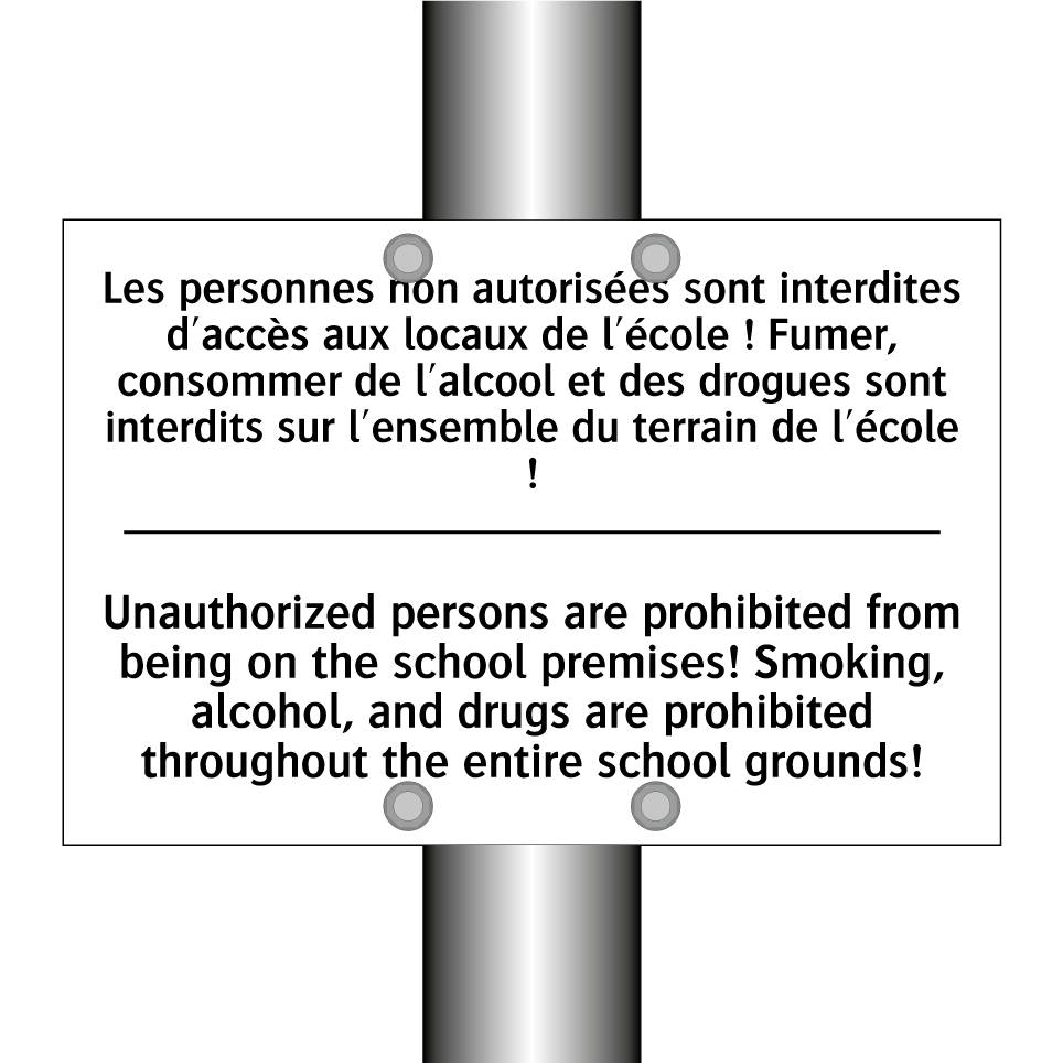 Panneau d'interdiction bilingue avec texte en français : "Les personnes non autorisées sont interdites d'accès aux locaux de l'école ! Fumer, consommer de l'alcool et des drogues sont interdits sur l'ensemble du terrain de l'école !", et en anglais : "Unauthorized persons are prohibited from being on the school premises! Smoking, alcohol, and drugs are prohibited throughout the entire school grounds!"