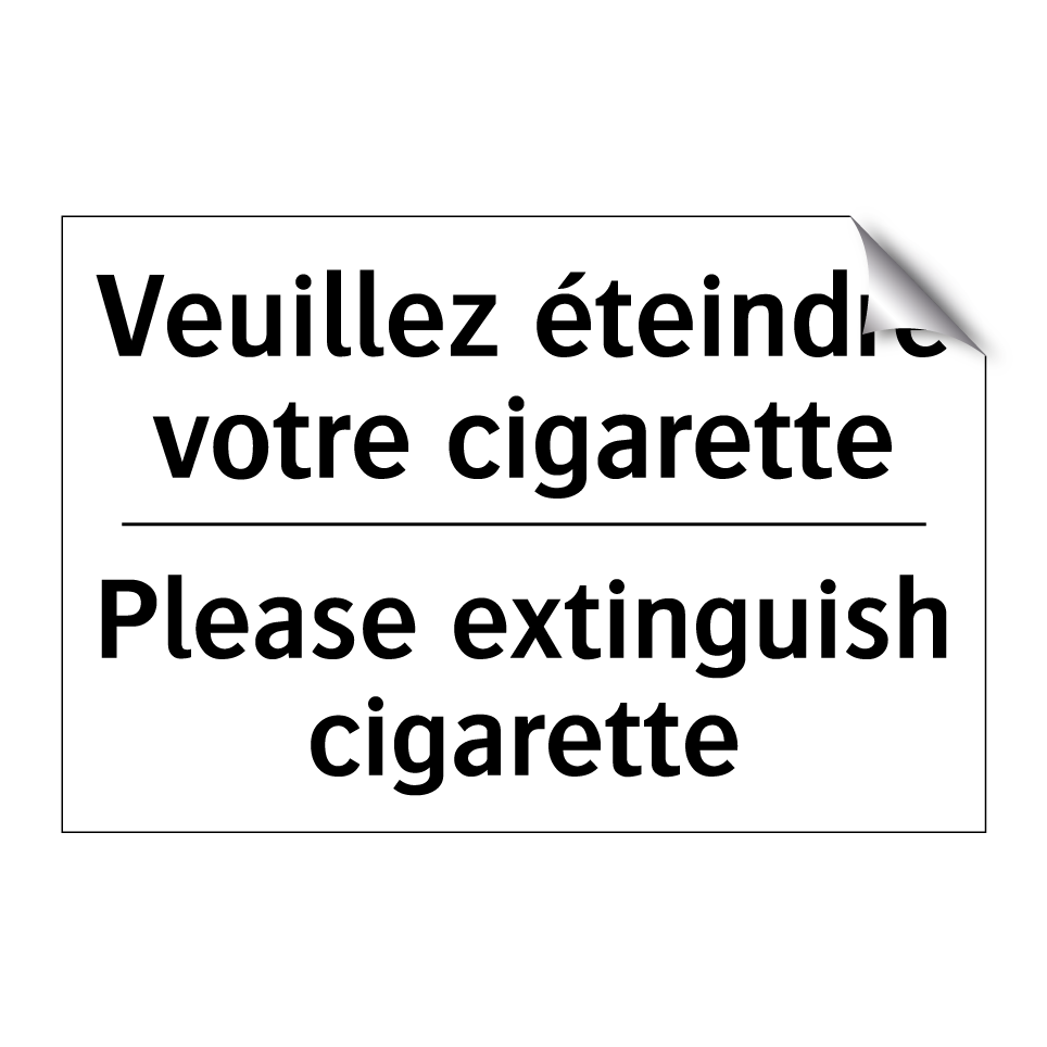Panneau d'interdiction bilingue avec texte en français : "Veuillez éteindre votre cigarette", et en anglais : "Please extinguish cigarette"