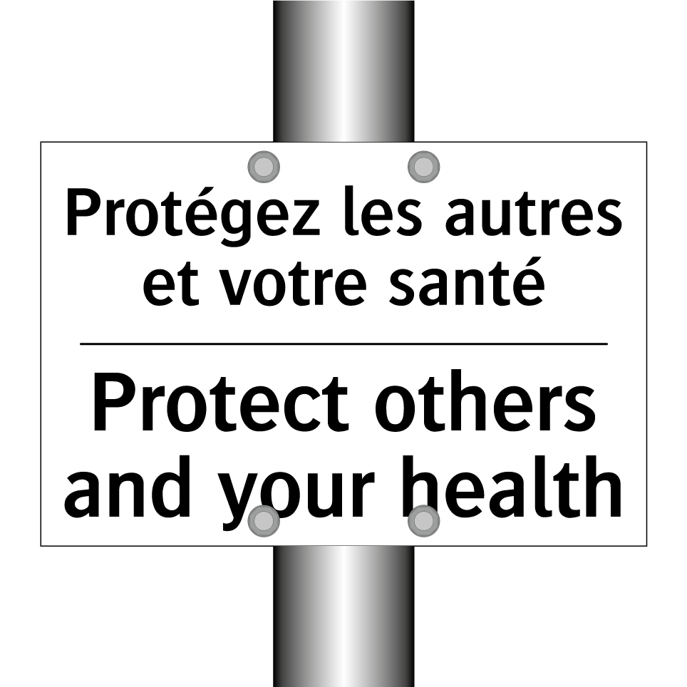 Panneau d'interdiction bilingue avec texte en français : "Protégez les autres et votre santé", et en anglais : "Protect others and your health"