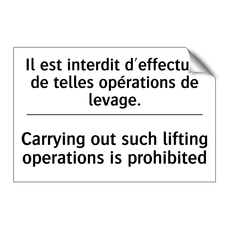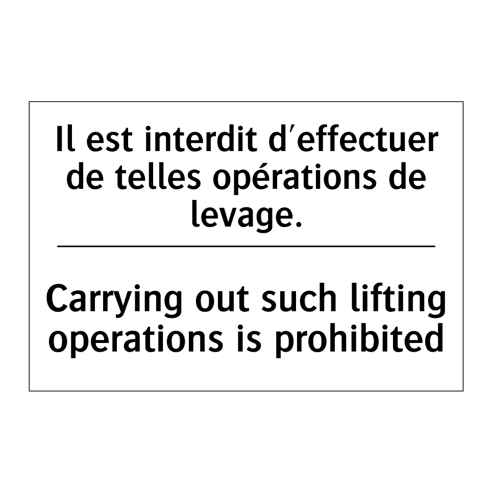 Panneau d'interdiction bilingue avec texte en français : "Il est interdit d'effectuer de telles opérations de levage.", et en anglais : "Carrying out such lifting operations is prohibited"