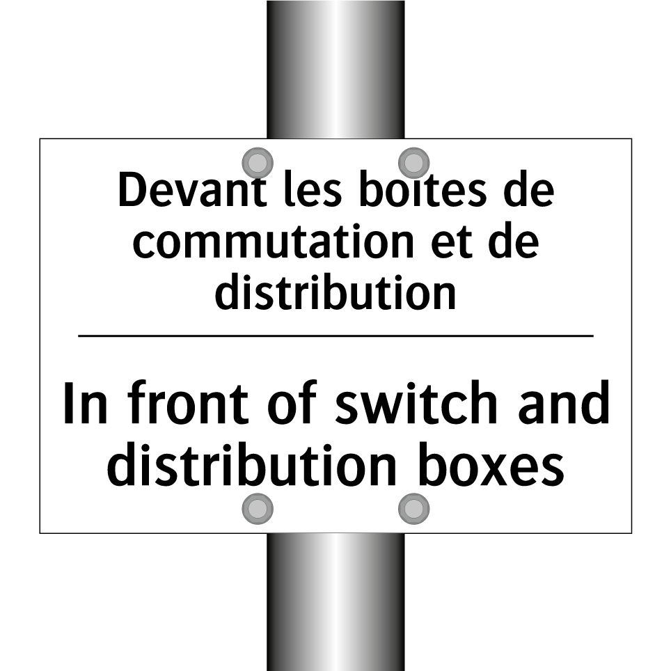 Panneau d'interdiction bilingue avec texte en français : "Devant les boîtes de commutation et de distribution", et en anglais : "In front of switch and distribution boxes"