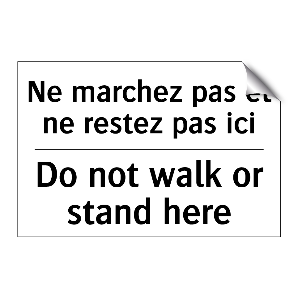 Panneau d'interdiction bilingue avec texte en français : "Ne marchez pas et ne restez pas ici", et en anglais : "Do not walk or stand here"