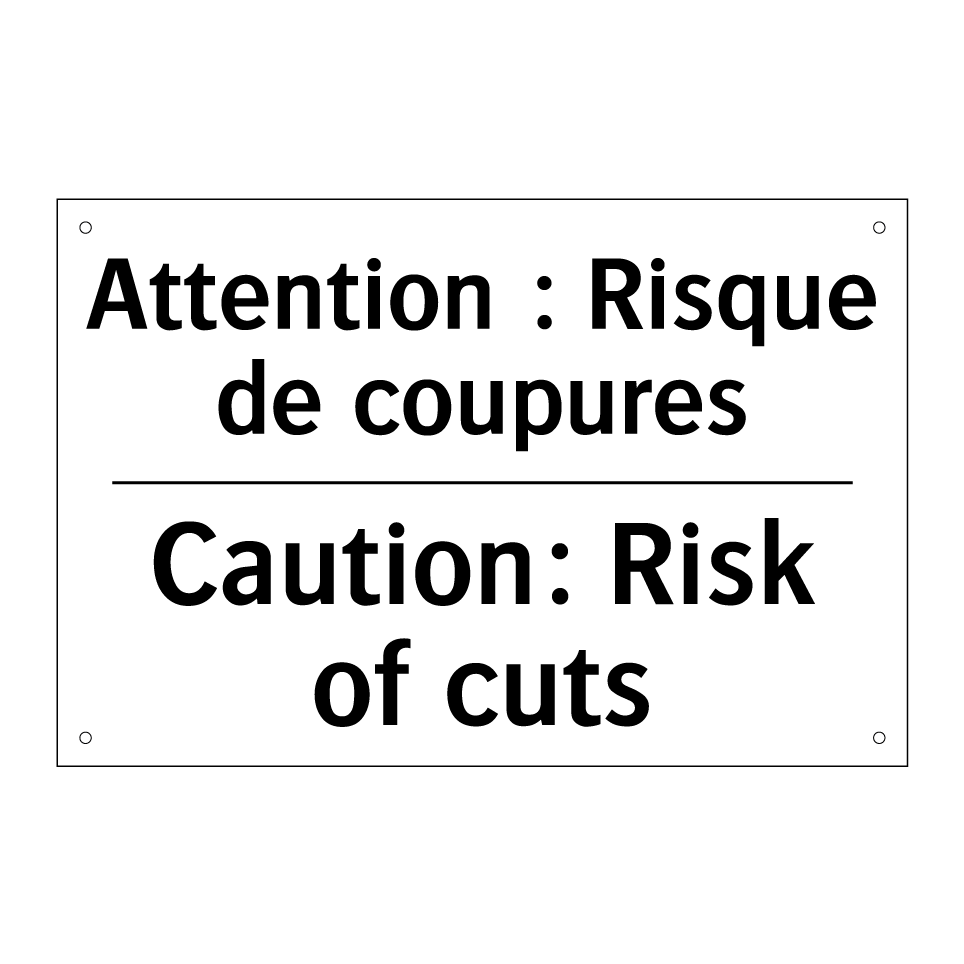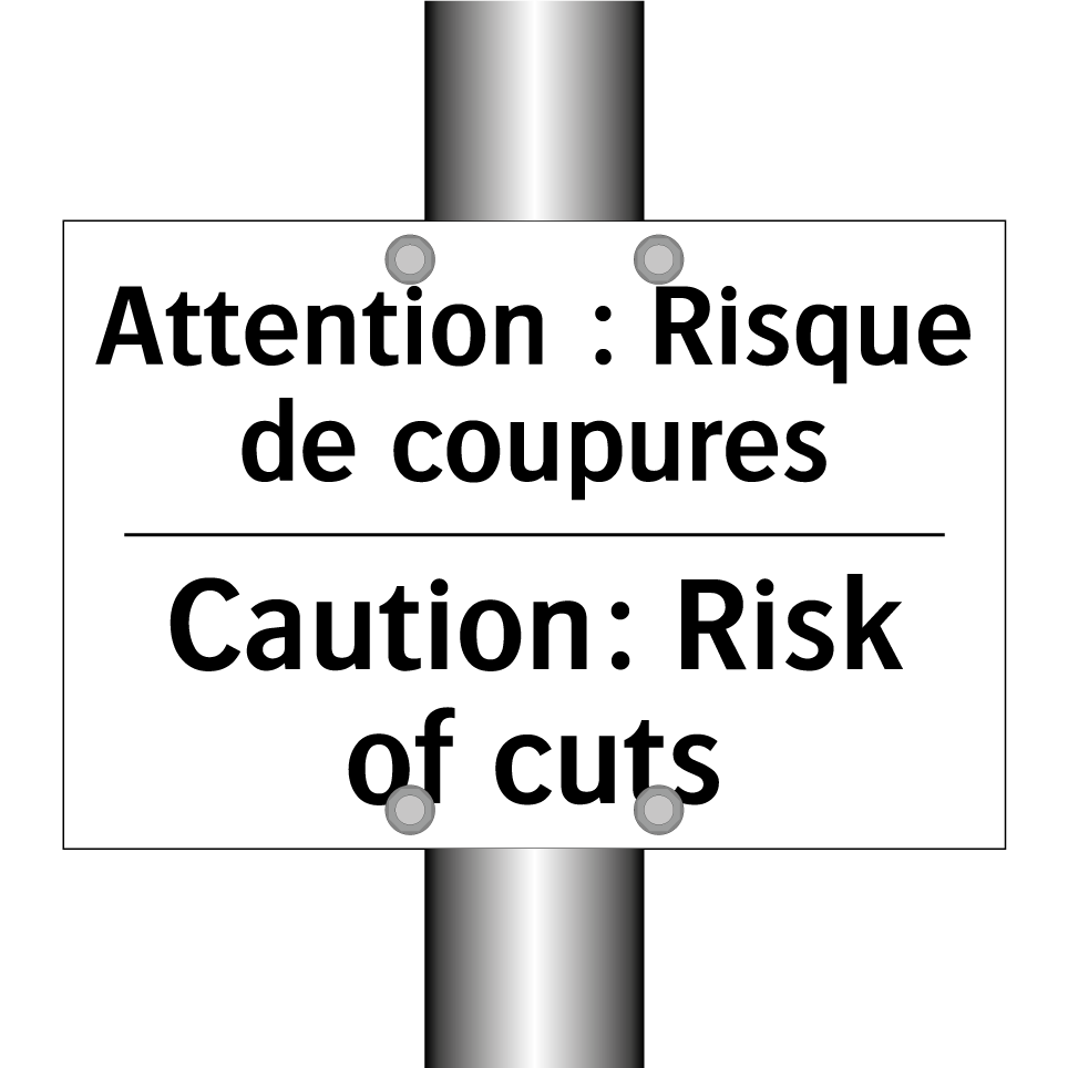 Panneau d'interdiction bilingue avec texte en français : "Attention : Risque de coupures", et en anglais : "Caution: Risk of cuts"