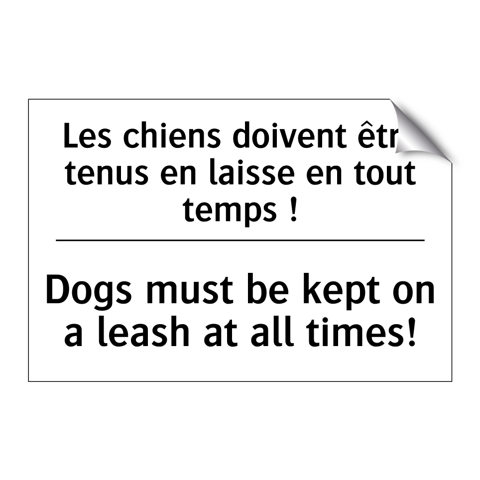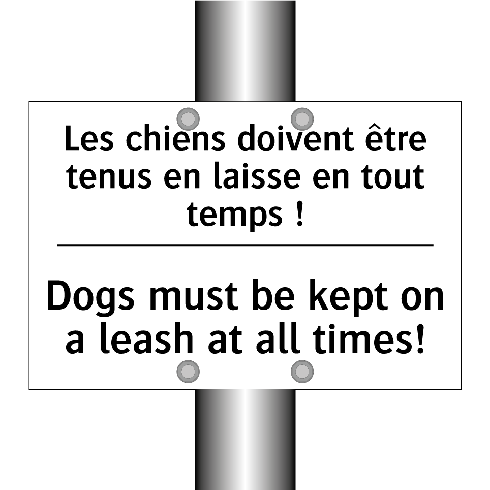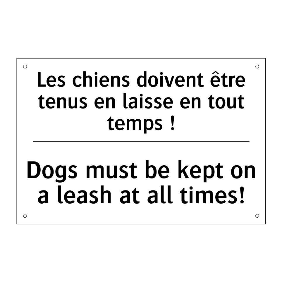 Panneau d'interdiction bilingue avec texte en français : "Les chiens doivent être tenus en laisse en tout temps !", et en anglais : "Dogs must be kept on a leash at all times!"