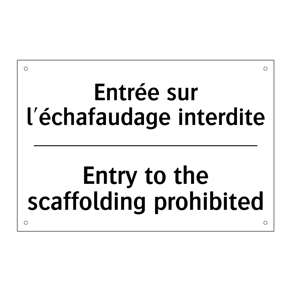 Panneau d'interdiction bilingue avec texte en français : "Entrée sur l'échafaudage interdite", et en anglais : "Entry to the scaffolding prohibited"
