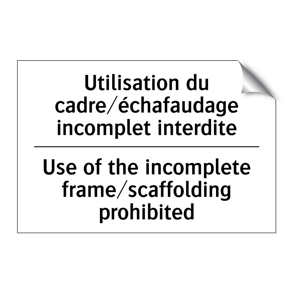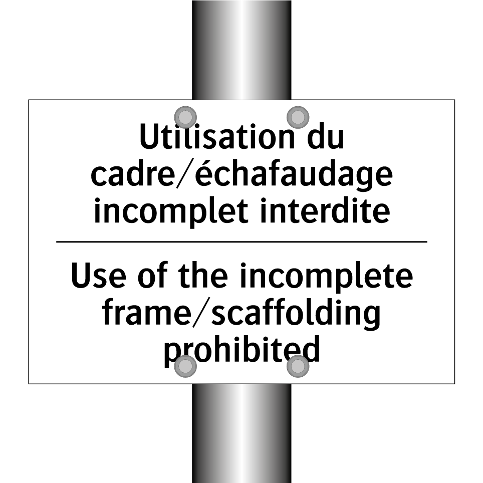 Panneau d'interdiction bilingue avec texte en français : "Utilisation du cadre/échafaudage incomplet interdite", et en anglais : "Use of the incomplete frame/scaffolding prohibited"