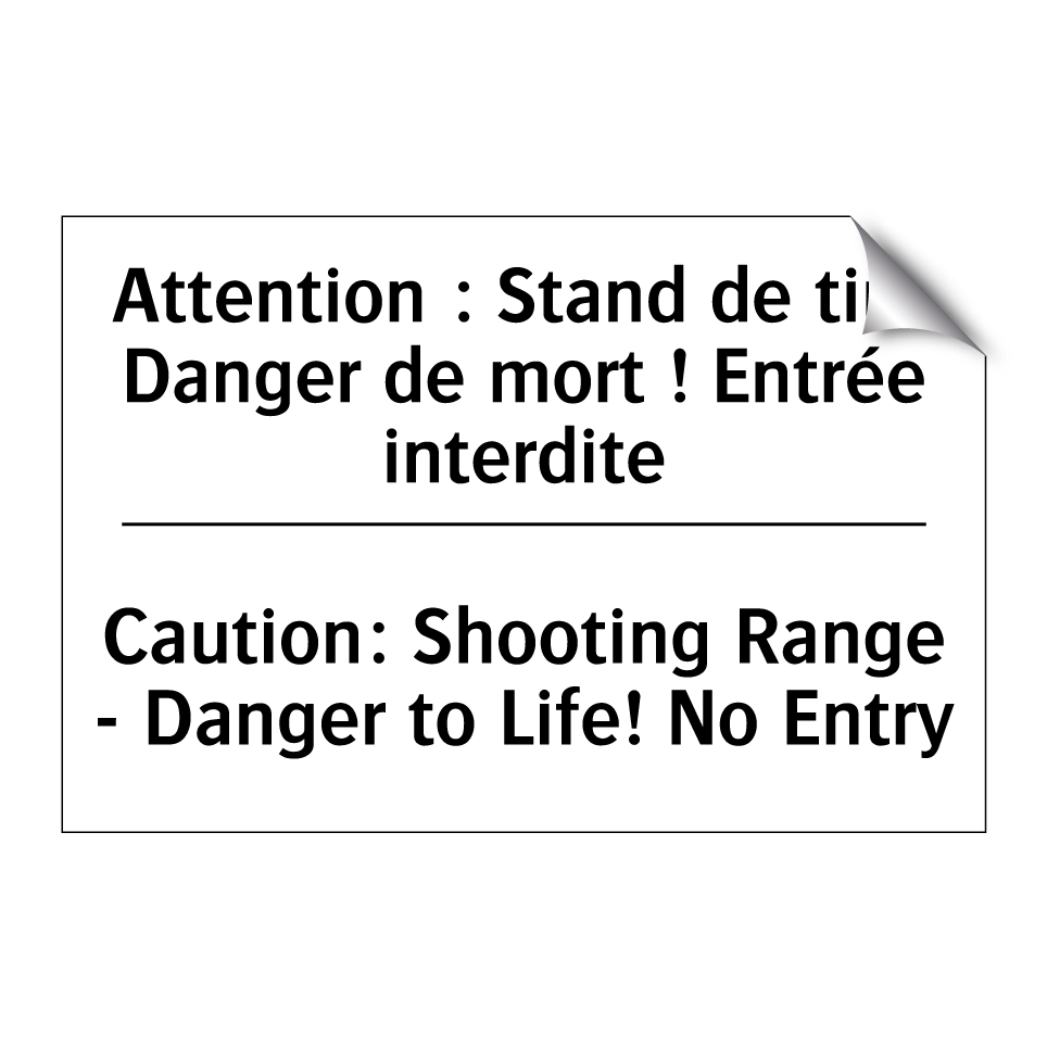 Panneau d'interdiction bilingue avec texte en français : "Attention : Stand de tir - Danger de mort ! Entrée interdite", et en anglais : "Caution: Shooting Range - Danger to Life! No Entry"