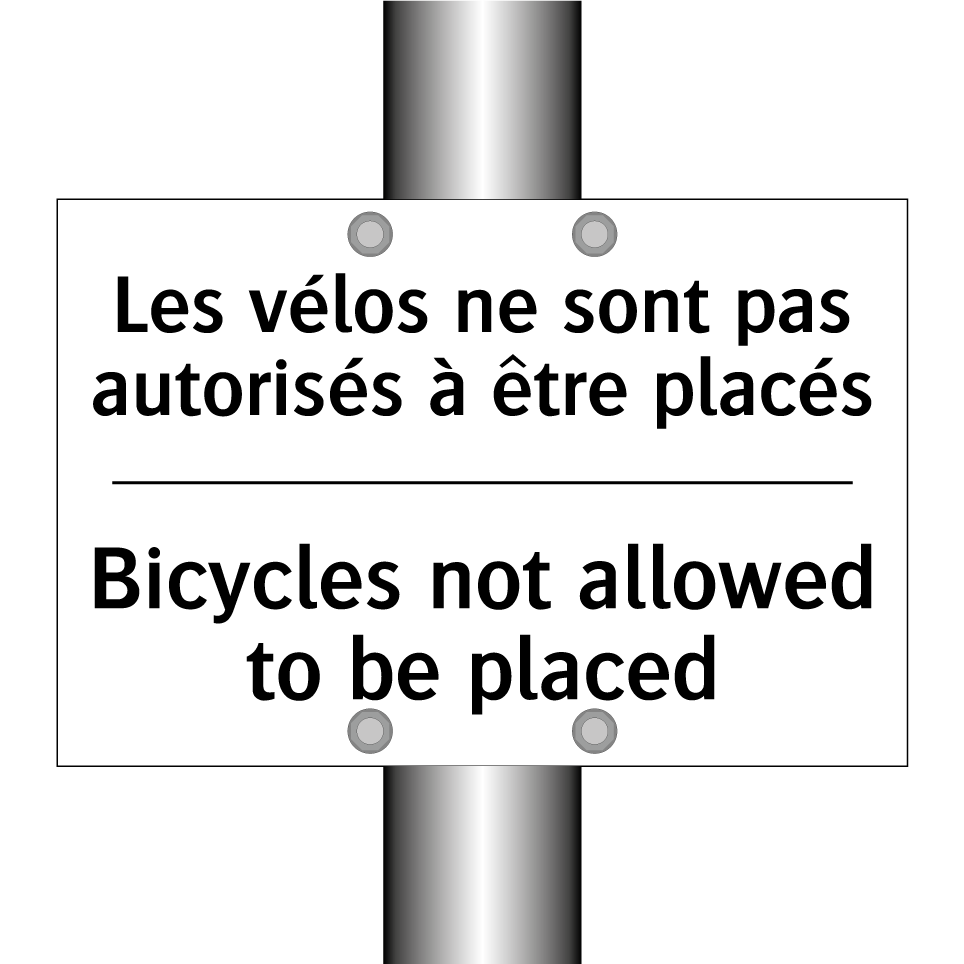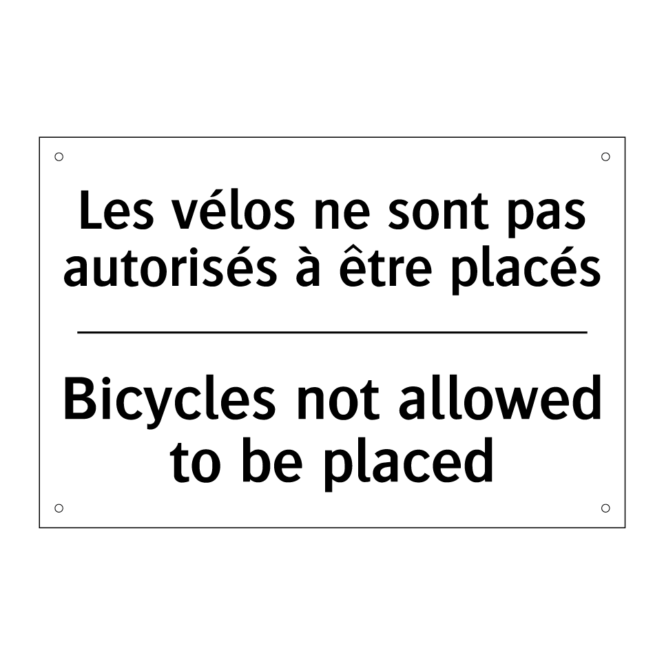 Panneau d'interdiction bilingue avec texte en français : "Les vélos ne sont pas autorisés à être placés", et en anglais : "Bicycles not allowed to be placed"