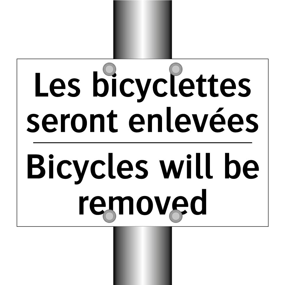 Panneau d'interdiction bilingue avec texte en français : "Les bicyclettes seront enlevées", et en anglais : "Bicycles will be removed"