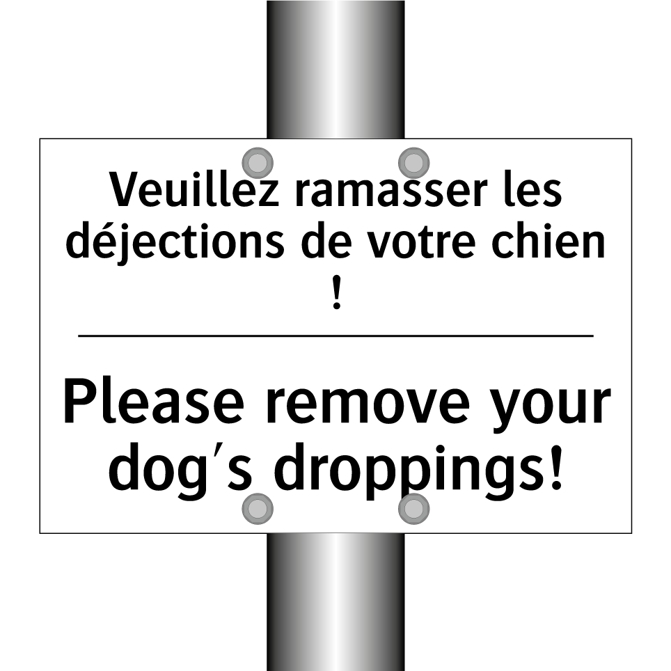 Panneau d'interdiction bilingue avec texte en français : "Veuillez ramasser les déjections de votre chien !", et en anglais : "Please remove your dog's droppings!"