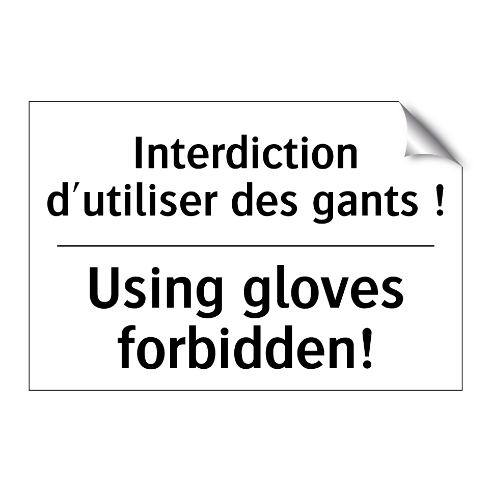 Panneau d'interdiction bilingue avec texte en français : "Interdiction d'utiliser des gants !", et en anglais : "Using gloves forbidden!"