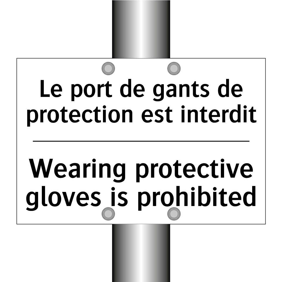 Panneau d'interdiction bilingue avec texte en français : "Le port de gants de protection est interdit", et en anglais : "Wearing protective gloves is prohibited"