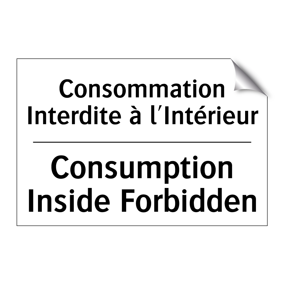 Panneau d'interdiction bilingue avec texte en français : "Consommation Interdite à l'Intérieur", et en anglais : "Consumption Inside Forbidden"