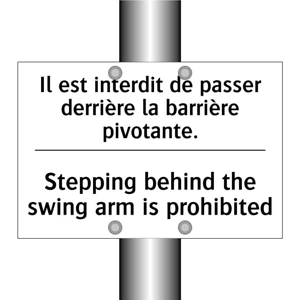 Panneau d'interdiction bilingue avec texte en français : "Il est interdit de passer derrière la barrière pivotante.", et en anglais : "Stepping behind the swing arm is prohibited"