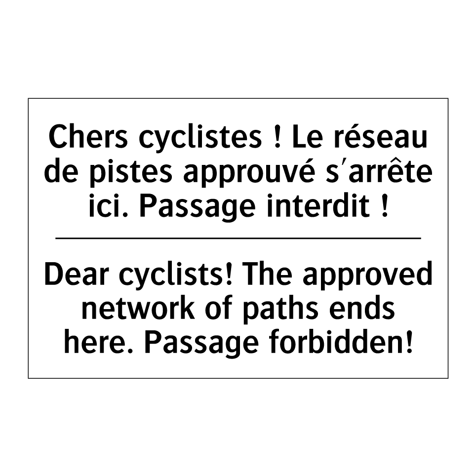 Panneau d'interdiction bilingue avec texte en français : "Chers cyclistes ! Le réseau de pistes approuvé s'arrête ici. Passage interdit !", et en anglais : "Dear cyclists! The approved network of paths ends here. Passage forbidden!"