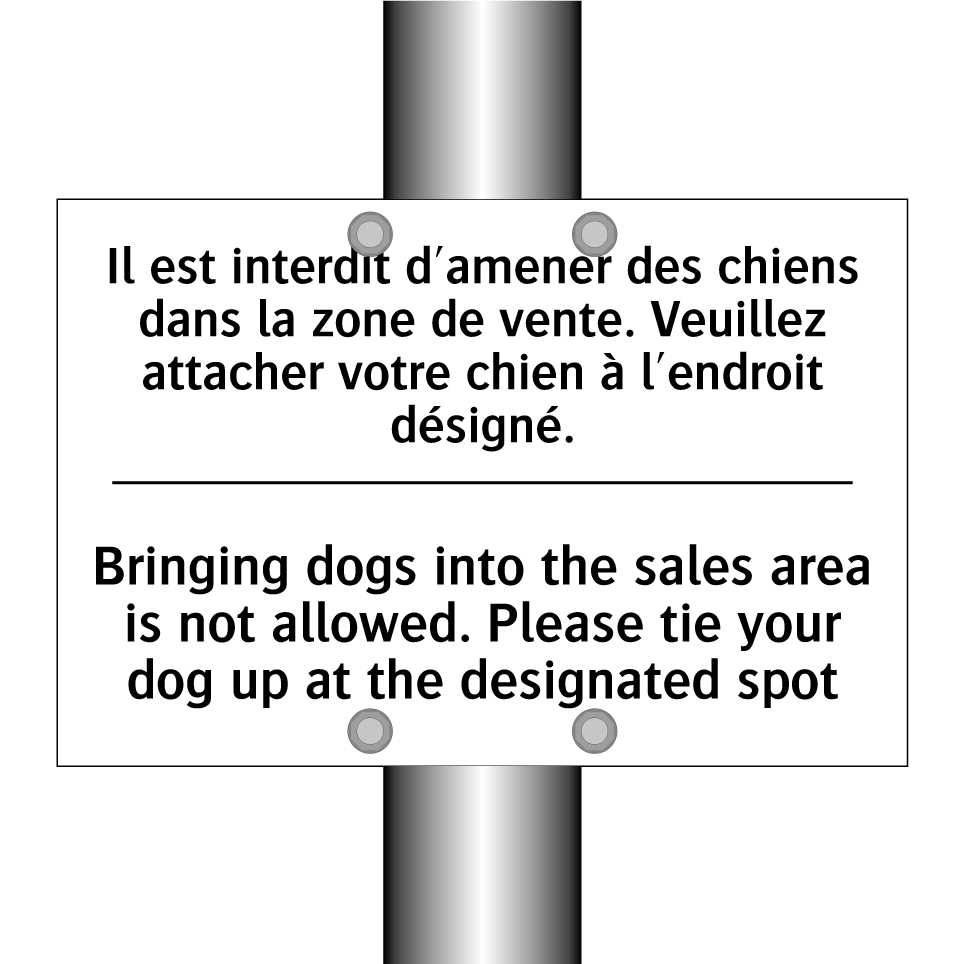Panneau d'interdiction bilingue avec texte en français : "Il est interdit d'amener des chiens dans la zone de vente. Veuillez attacher votre chien à l'endroit désigné.", et en anglais : "Bringing dogs into the sales area is not allowed. Please tie your dog up at the designated spot"