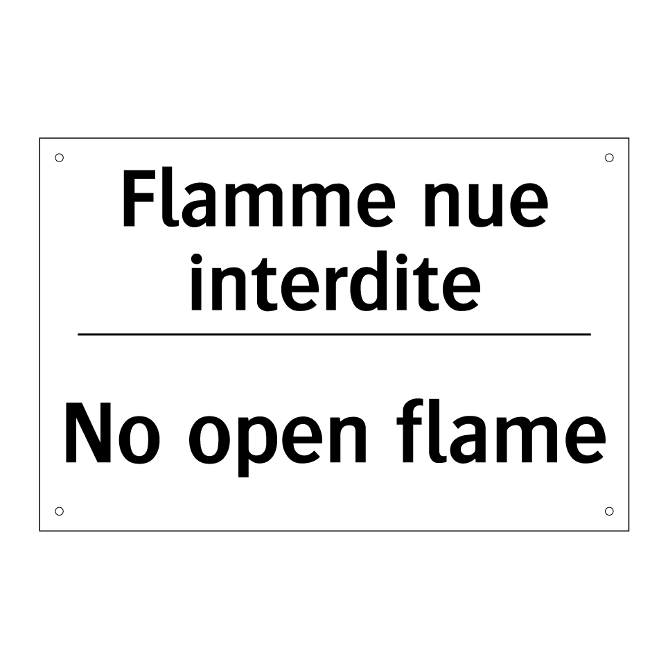 Panneau d'interdiction bilingue avec texte en français : "Flamme nue interdite", et en anglais : "No open flame"