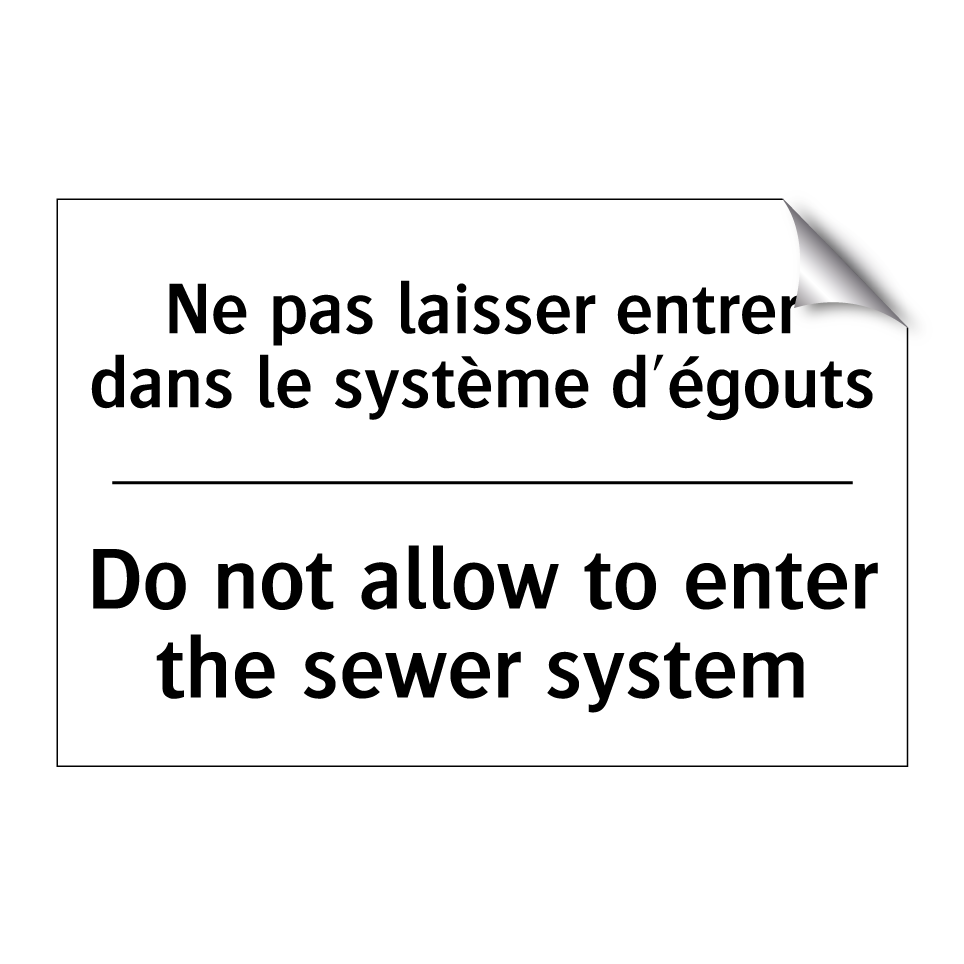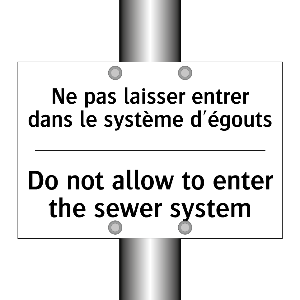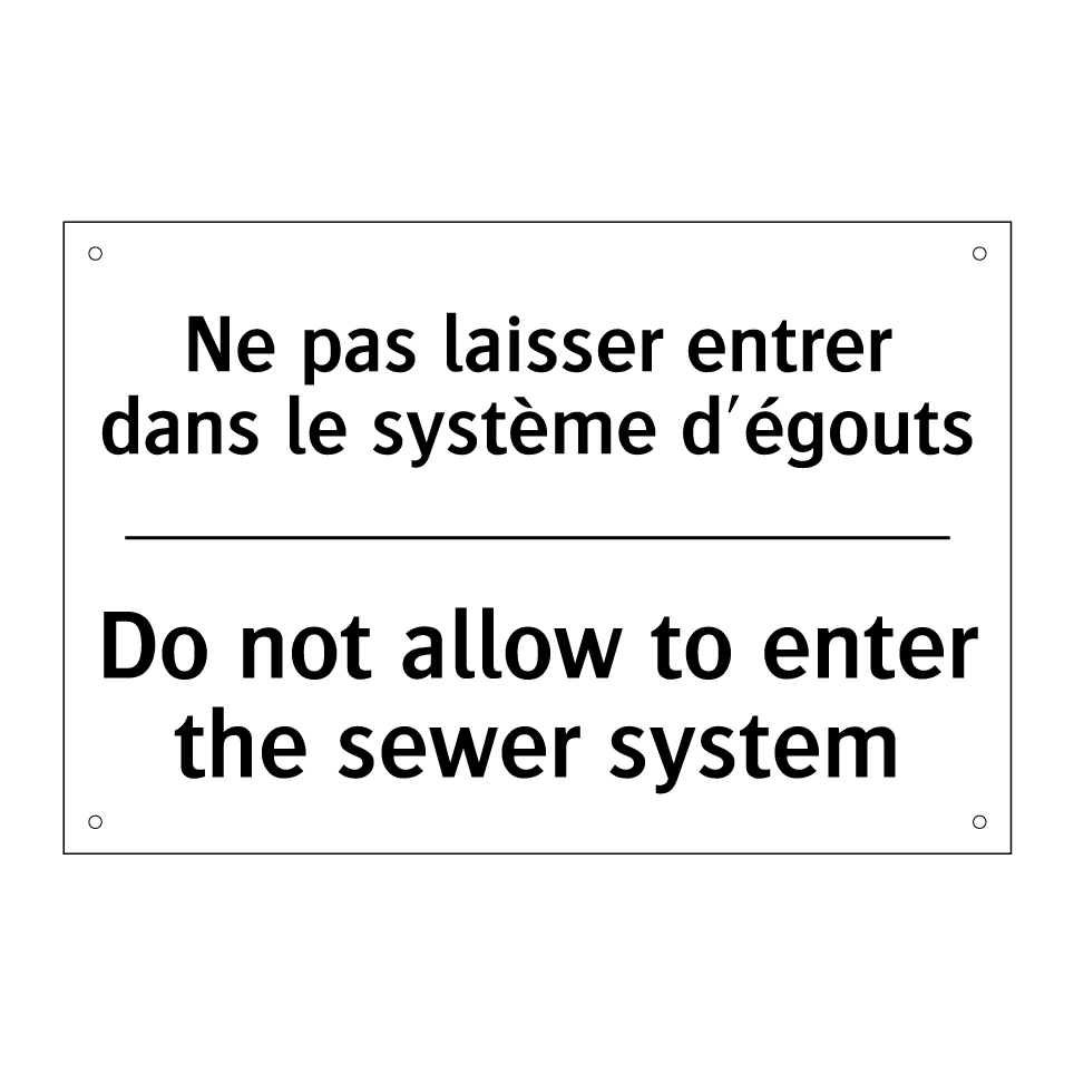 Panneau d'interdiction bilingue avec texte en français : "Ne pas laisser entrer dans le système d'égouts", et en anglais : "Do not allow to enter the sewer system"