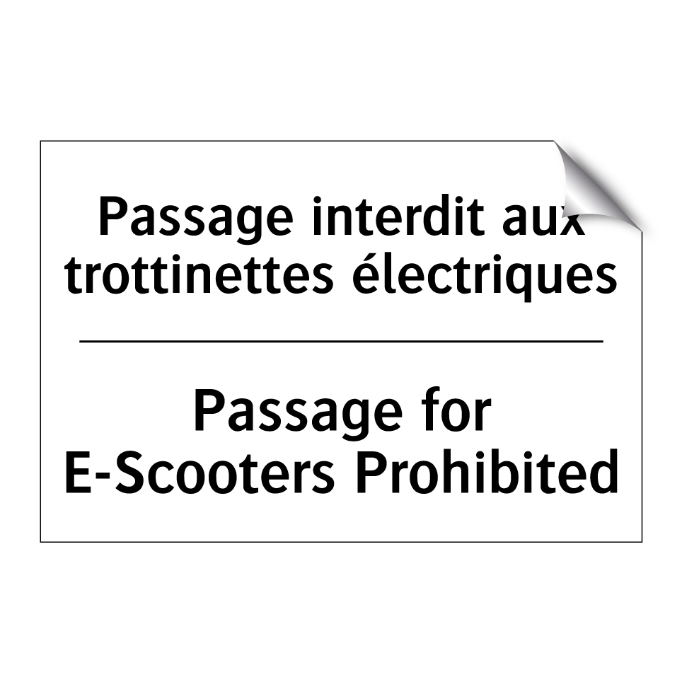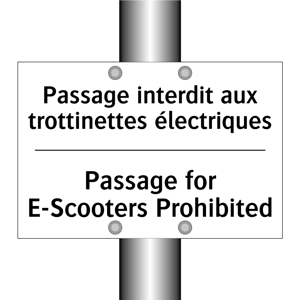 Panneau d'interdiction bilingue avec texte en français : "Passage interdit aux trottinettes électriques", et en anglais : "Passage for E-Scooters Prohibited"