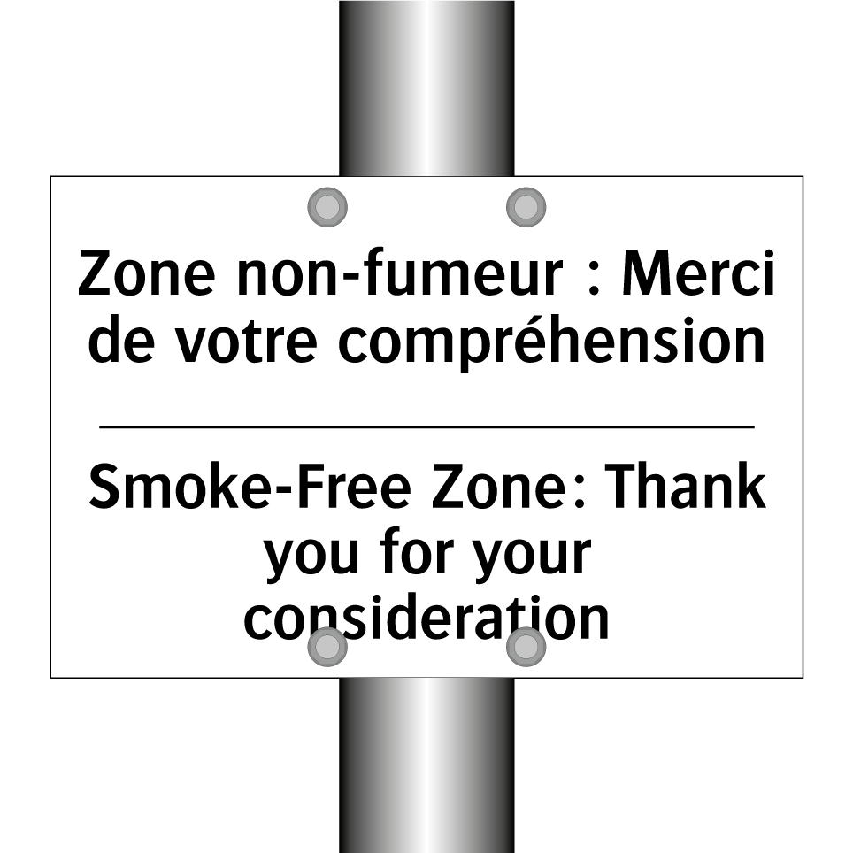 Panneau d'interdiction bilingue avec texte en français : "Zone non-fumeur : Merci de votre compréhension", et en anglais : "Smoke-Free Zone: Thank you for your consideration"
