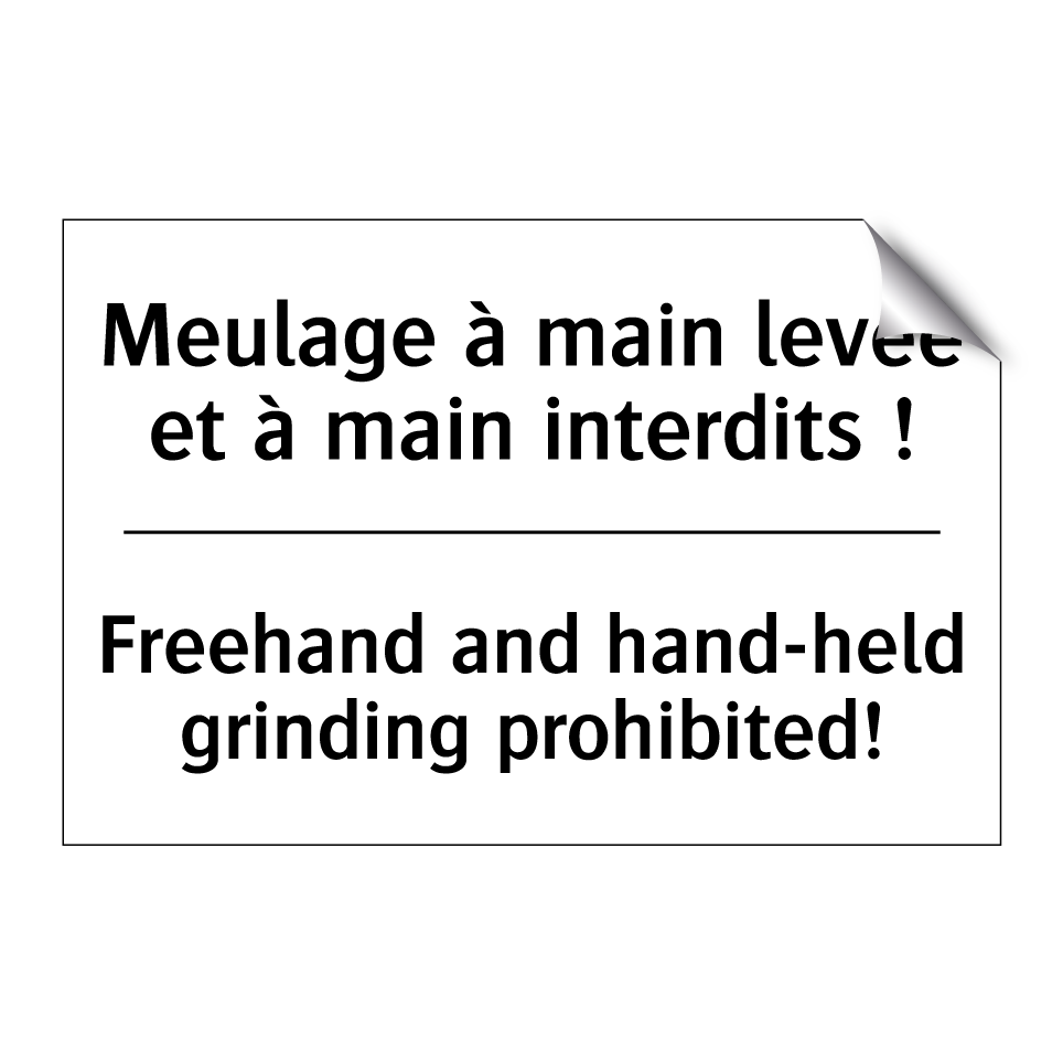 Panneau d'interdiction bilingue avec texte en français : "Meulage à main levée et à main interdits !", et en anglais : "Freehand and hand-held grinding prohibited!"