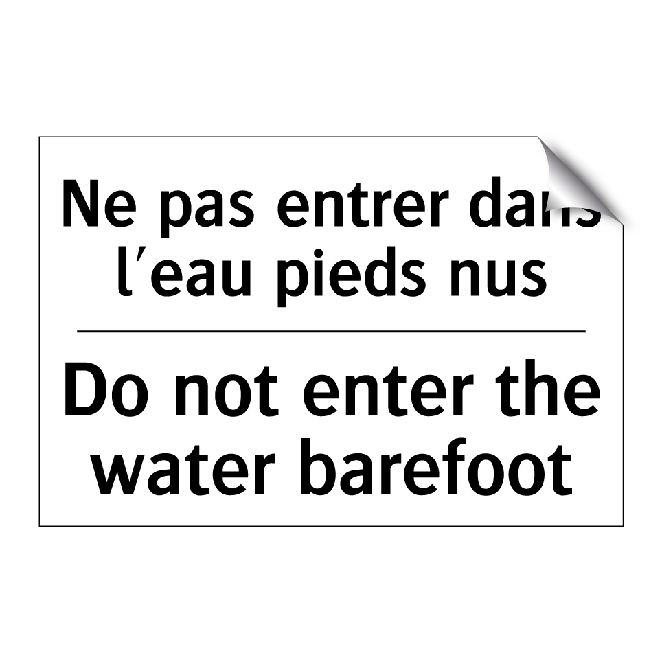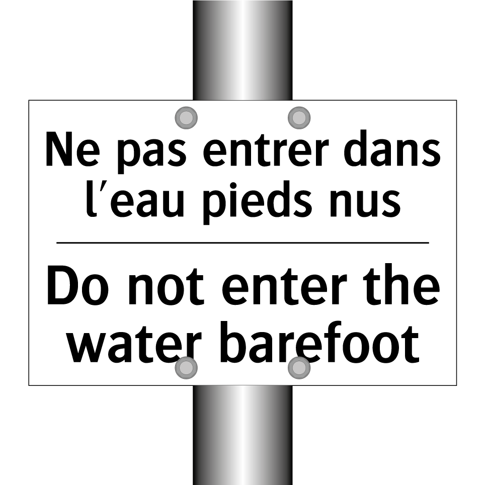 Panneau d'interdiction bilingue avec texte en français : "Ne pas entrer dans l'eau pieds nus", et en anglais : "Do not enter the water barefoot"