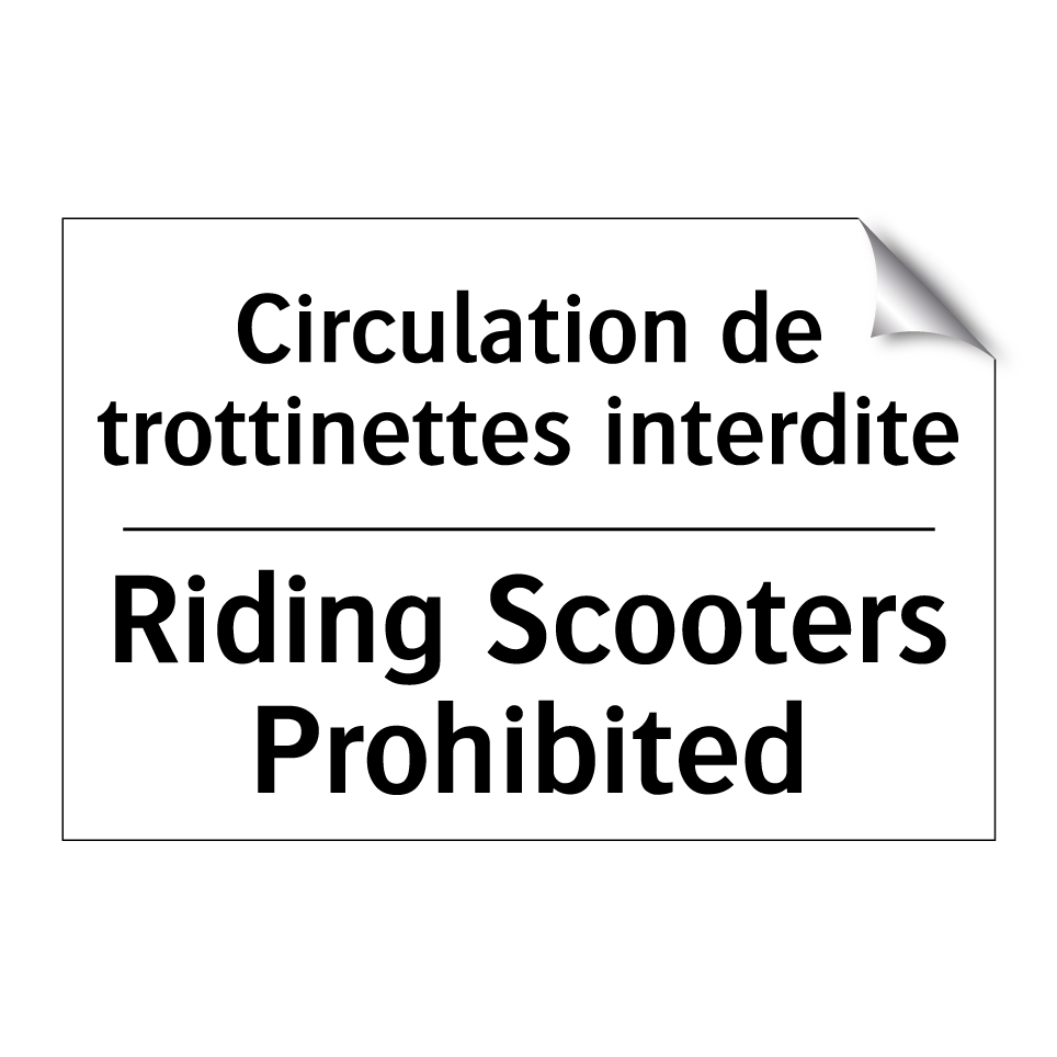 Panneau d'interdiction bilingue avec texte en français : "Circulation de trottinettes interdite", et en anglais : "Riding Scooters Prohibited"