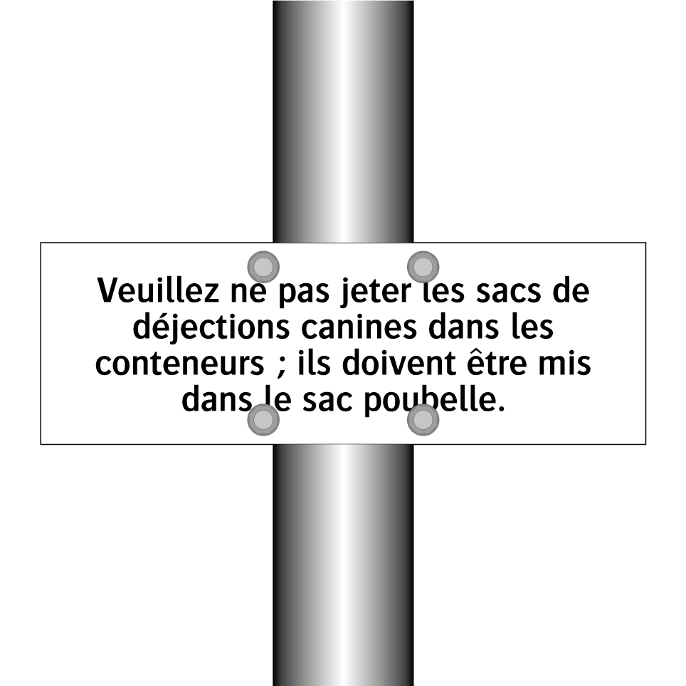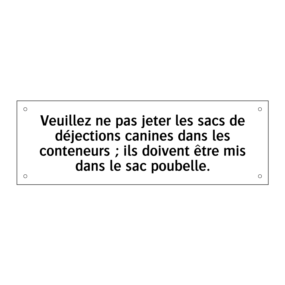 Panneau d'interdiction avec le texte : "Veuillez ne pas jeter les sacs de déjections canines dans les conteneurs ; ils doivent être mis dans le sac poubelle."