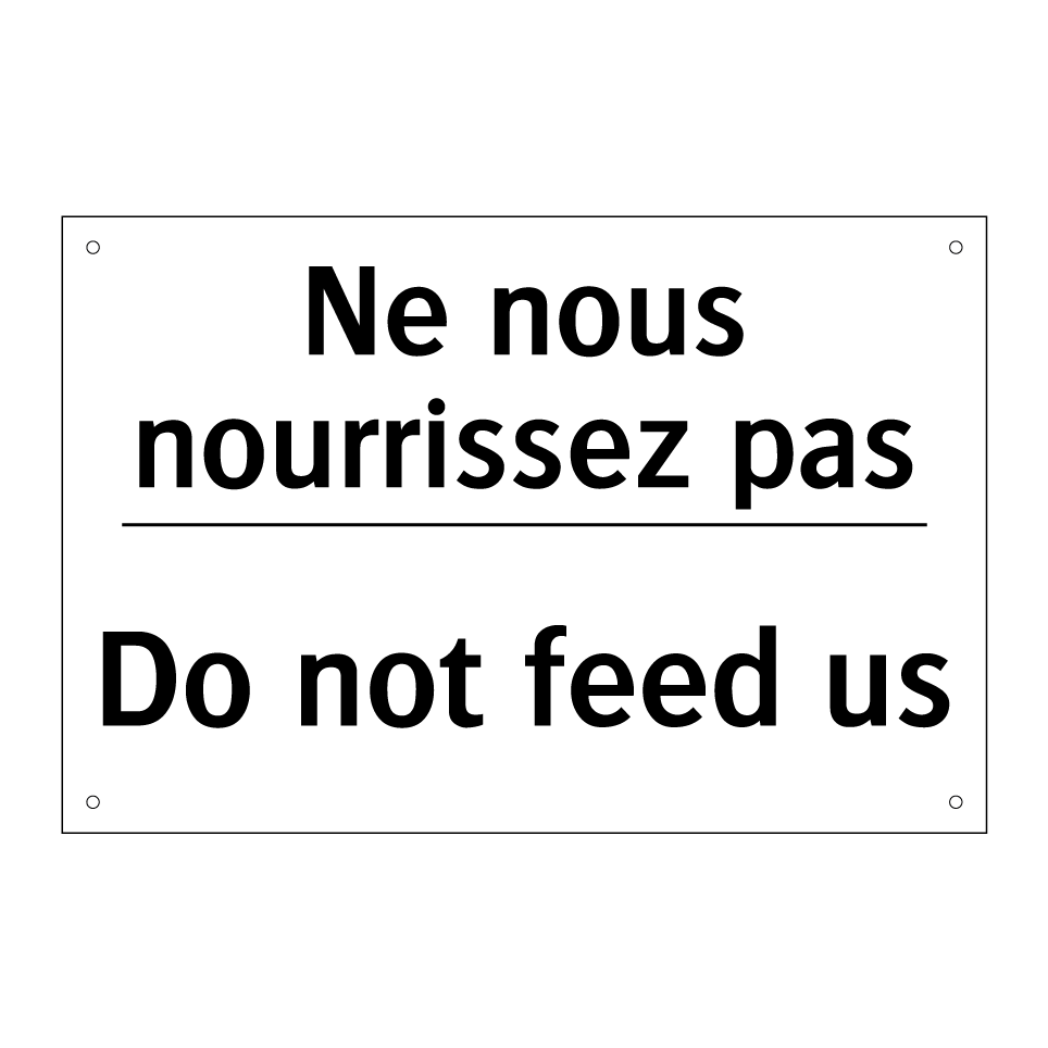 Panneau d'interdiction bilingue avec texte en français : "Ne nous nourrissez pas", et en anglais : "Do not feed us"