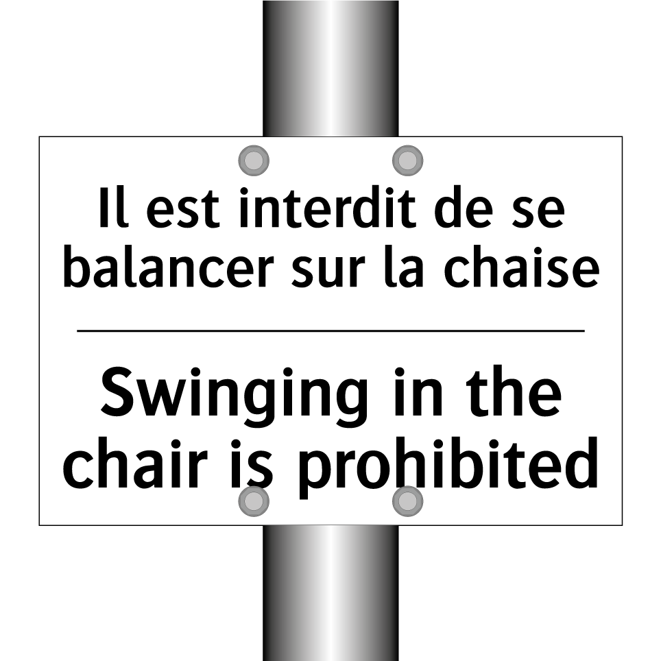 Panneau d'interdiction bilingue avec texte en français : "Il est interdit de se balancer sur la chaise", et en anglais : "Swinging in the chair is prohibited"