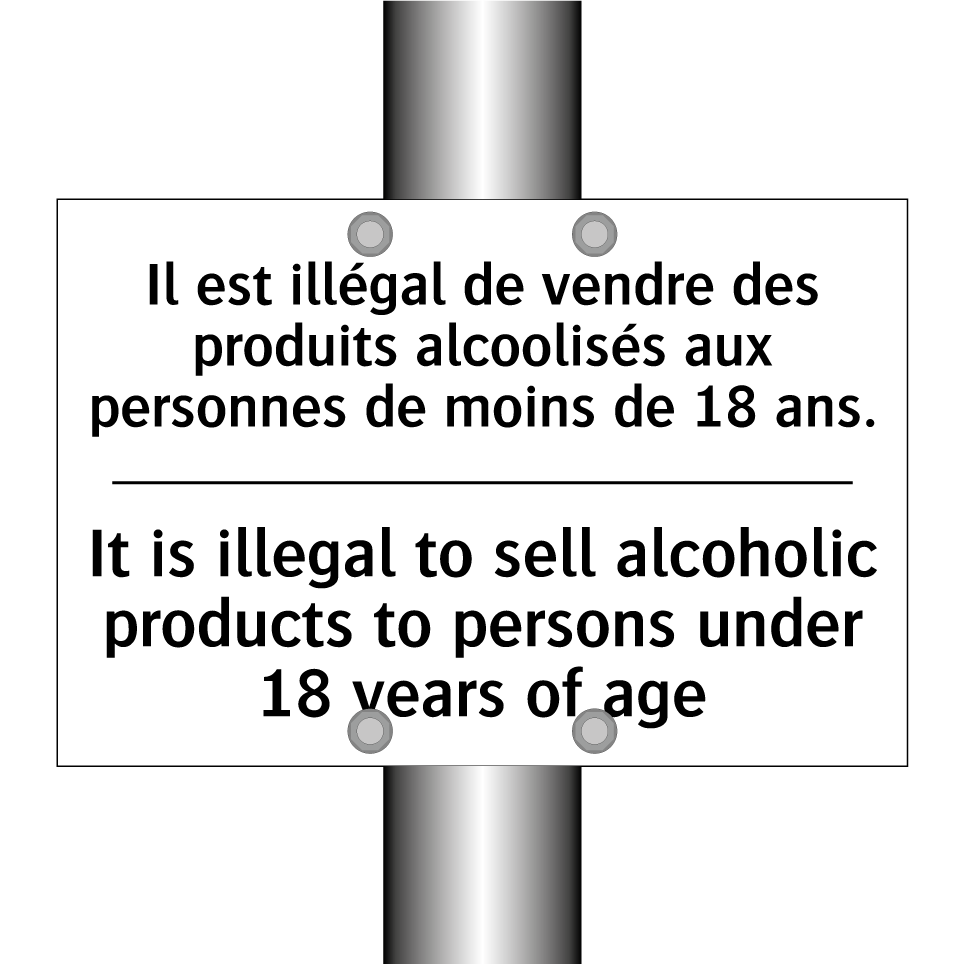 Panneau d'interdiction bilingue avec texte en français : "Il est illégal de vendre des produits alcoolisés aux personnes de moins de 18 ans.", et en anglais : "It is illegal to sell alcoholic products to persons under 18 years of age"