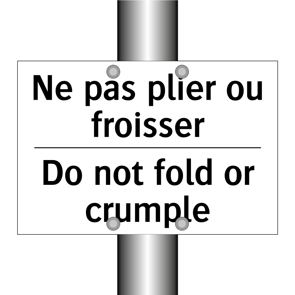 Panneau d'interdiction bilingue avec texte en français : "Ne pas plier ou froisser", et en anglais : "Do not fold or crumple"