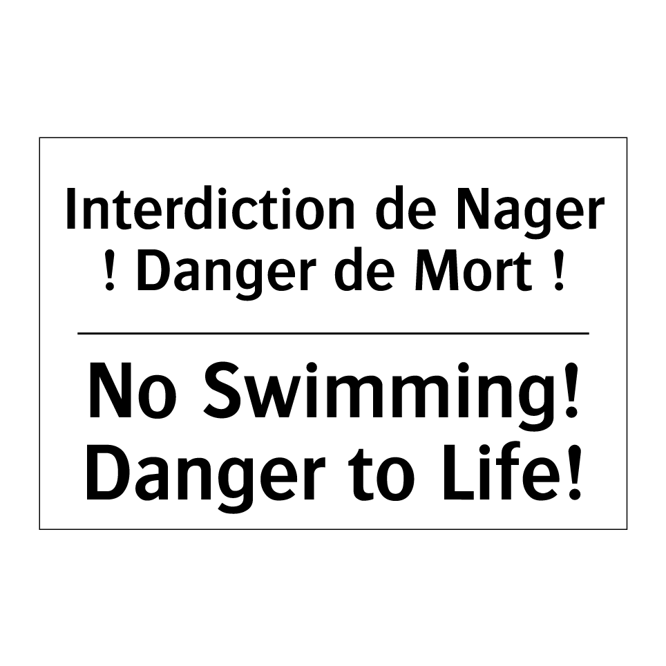 Panneau d'interdiction bilingue avec texte en français : "Interdiction de Nager ! Danger de Mort !", et en anglais : "No Swimming! Danger to Life!"